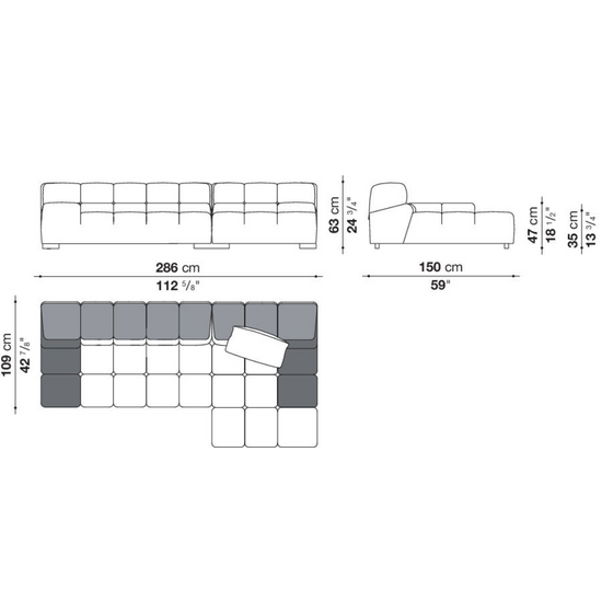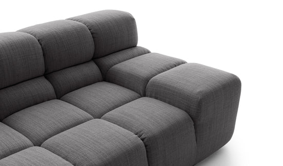 The Tufty-Time modular system starts with an ottoman as the basic piece, which is then accompanied by central, corner and terminal elements with a low or high armrest. The elements are used to invent traditional sofas, sofas with chaise longue, corner sofas and island elements that provide a 360° seating solution.