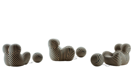 To celebrate the fiftieth anniversary of the Up series, designed by Gaetano Pesce in 1969, the iconic chair with ottoman UP5_6 wears a special dress: a beige/petrol green striped fabric based on the original colour palette.