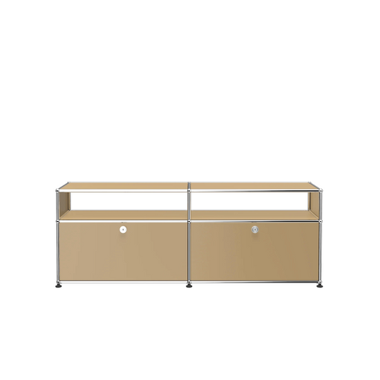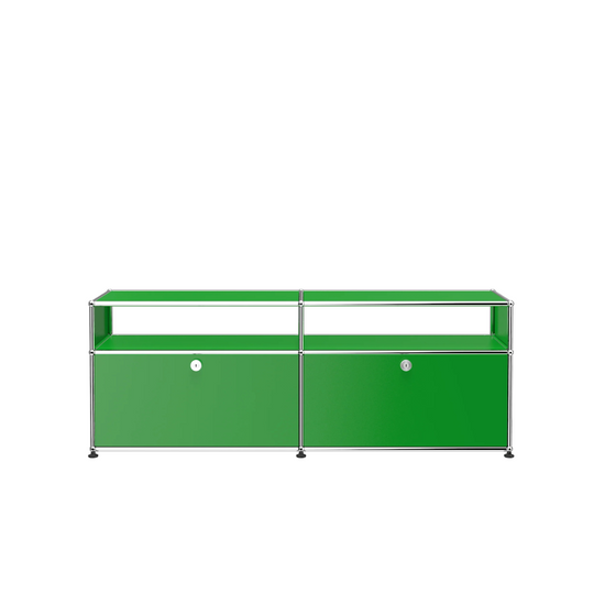 Media storage credenza with two drop-down doors that lock with the twist of a coin. Fitted with one cable cutout. Available in 14 standard surface colours.