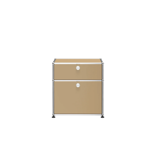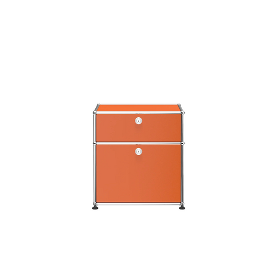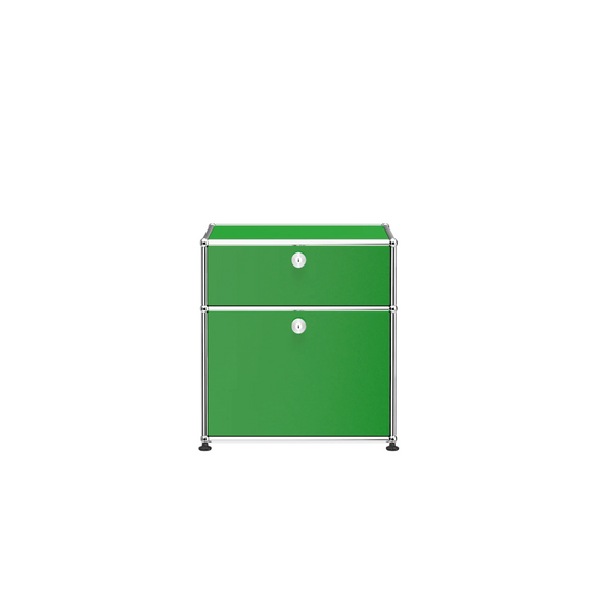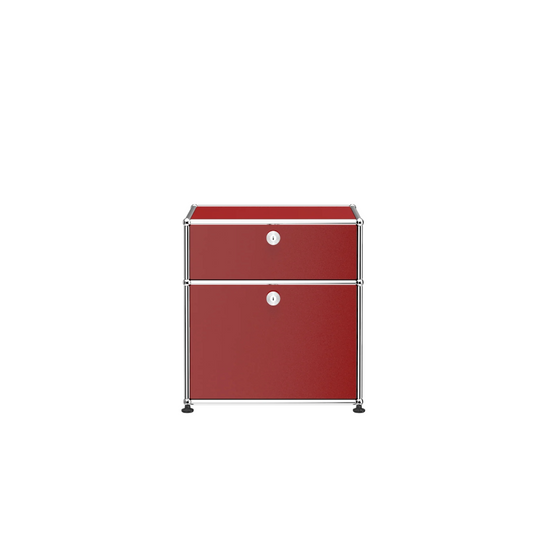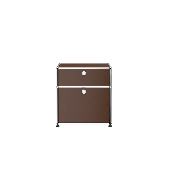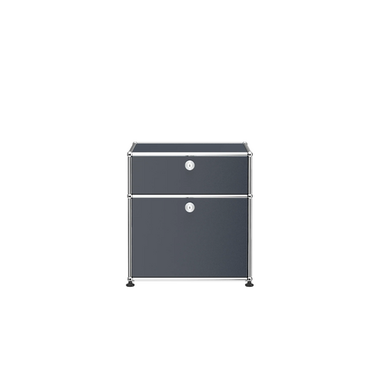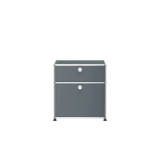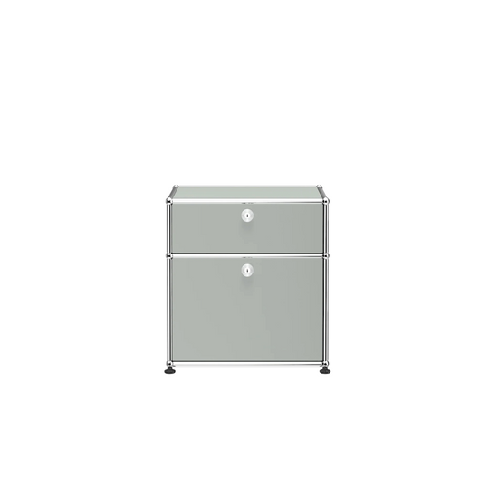 A modern and adaptable nightstand or side table with two drop-down doors that lock with the twist of a coin. Available in 14 standard surface colours.