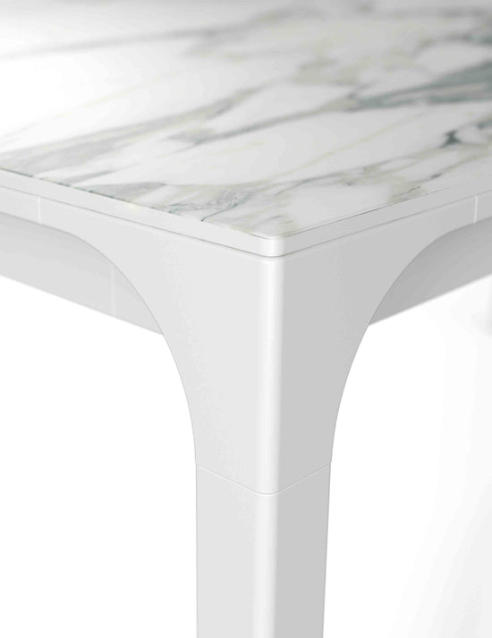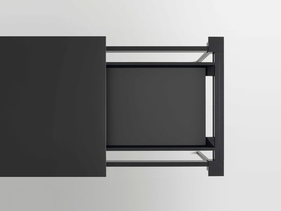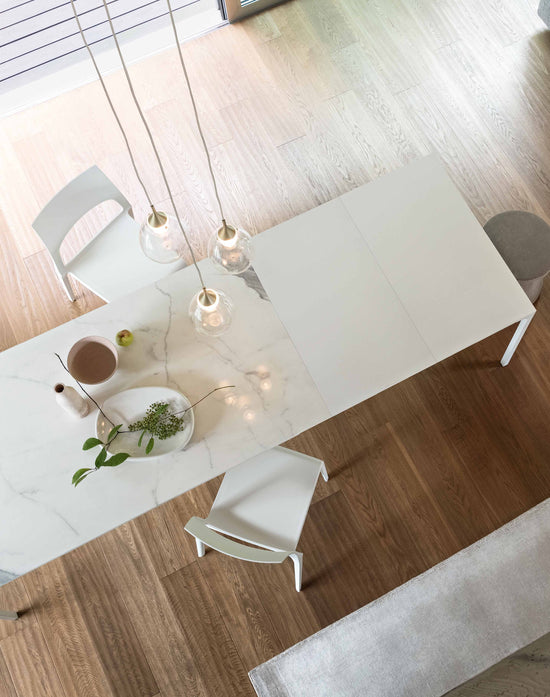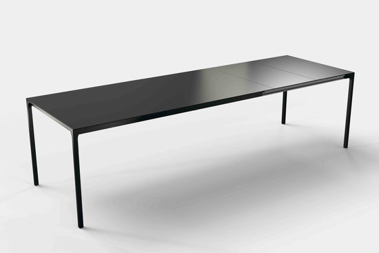 The main element is essentiality: starting from the name, “Zen”, up to the choice of materials, painted metal for the base and ceramic, glass or lacquered wood for the top. The extensions, in lacquered wood, allow the surface to be extended, creating a convenient additional space; thanks to the lateral movement, the legs are placed at the edge of the top and do not obstruct the seating of guests.