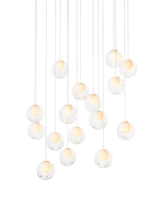 28.16 is comprised of 16 hand-blown glass pendants which attach using a fixed length jack connection to a white powder-coated canopy.