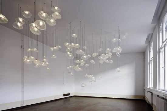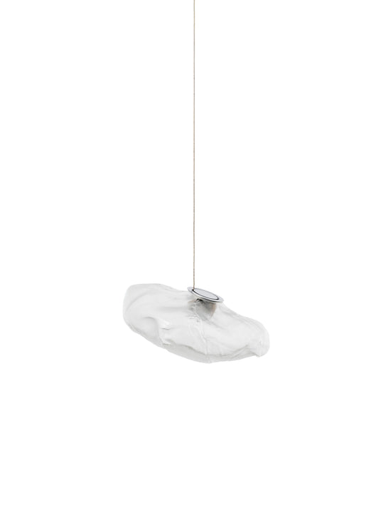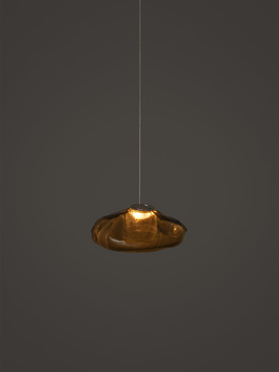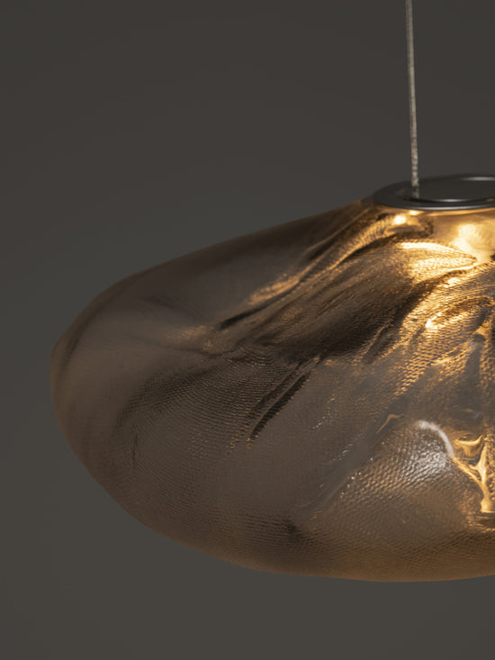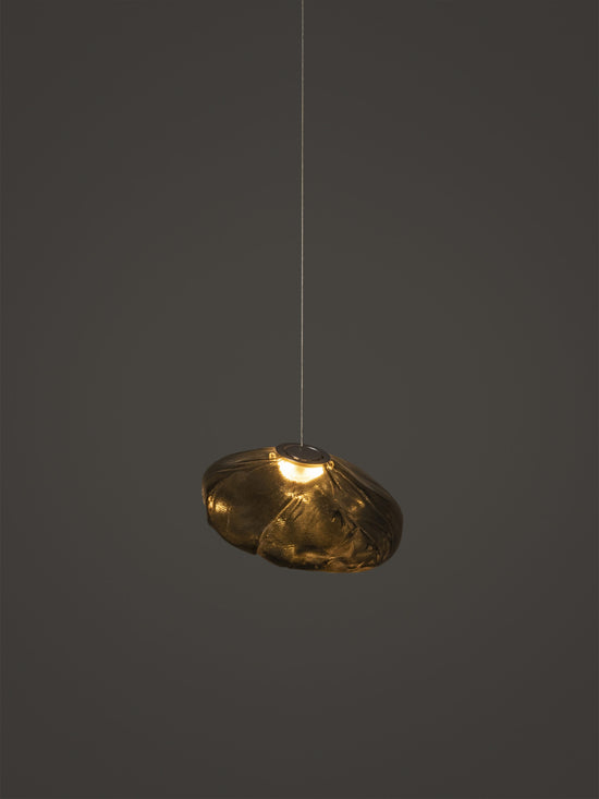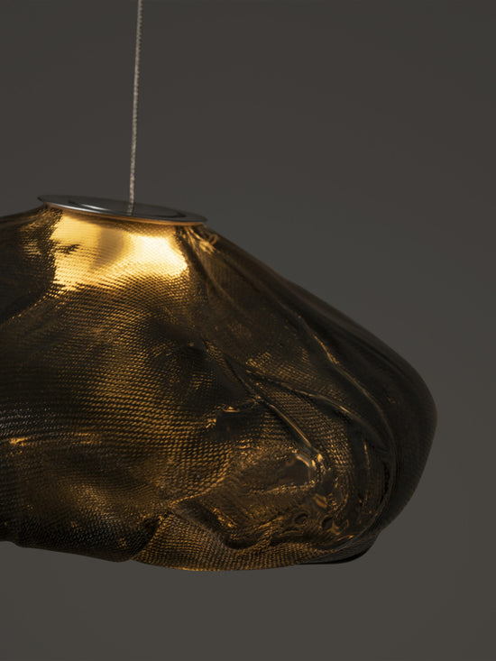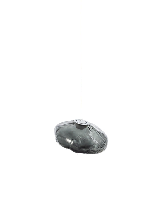 73.1 is composed of a single glass pendant, which is hand blown into a folded and highly heat-resistant ceramic fabric vessel.