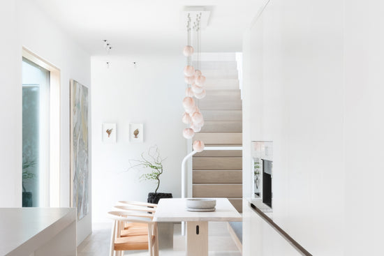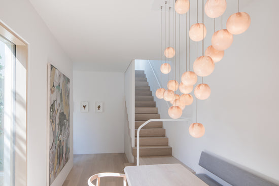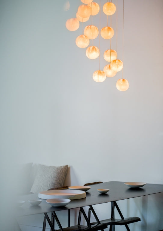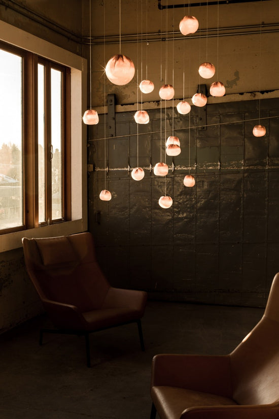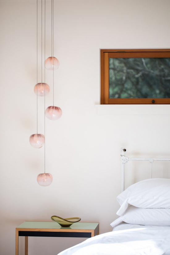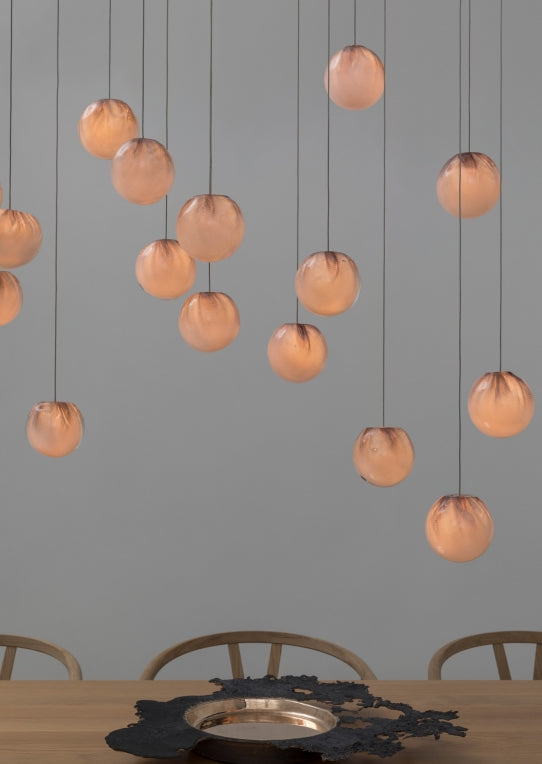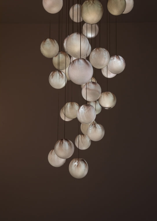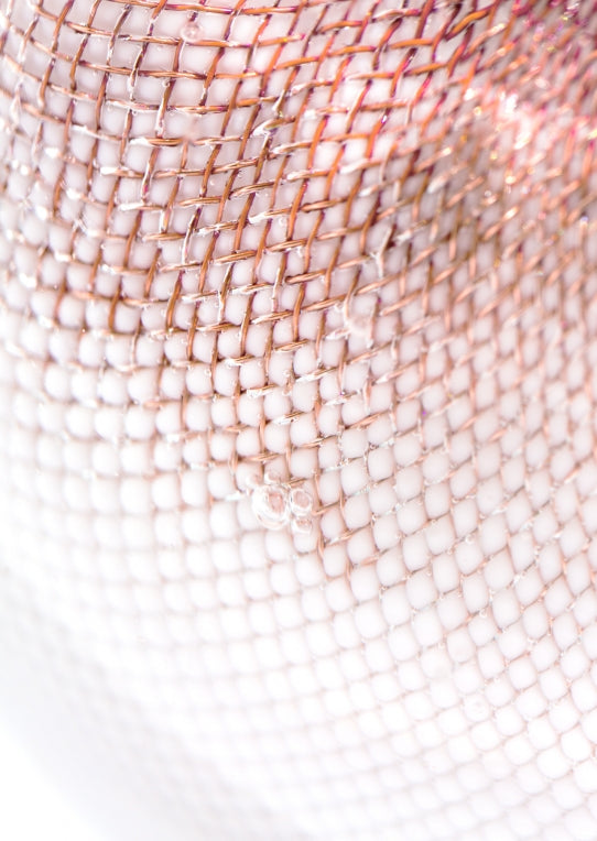A white glass moil is captured inside a fine copper mesh basket and then plunged into hot clear glass. Air is blown into the matrix to gently push the white glass through the mesh, creating a delicate pillowed form that is suspended inside the thick outer layer of clear glass. Sometimes the copper mesh basket folds and crinkles, adding specificity to each piece. Undulations in the exterior shape are a natural consequence of the fabrication process and accentuate the gentle white pillowing below. A low-voltage xenon or LED light source is introduced into the piece, casting a warm coppery hue.
