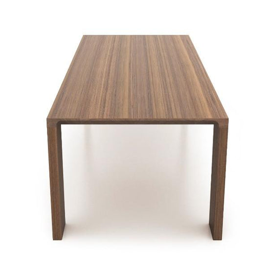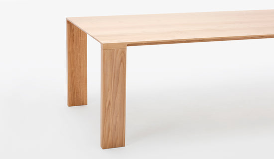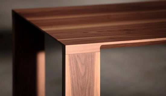 Concealed metal plates provide a seamless and rigid connection between the top and legs. Solid steel support bars inset in the top eliminate any potential for wood movement. The matte open-grain finish gives the wood a natural appearance yet is velvety smooth to touch and fully protects the wood from moisture and debris. Radii is available in solid White Oak and American Walnut. The Radii collection also includes the Radii Bench.