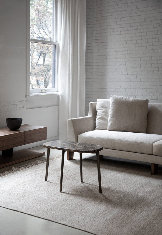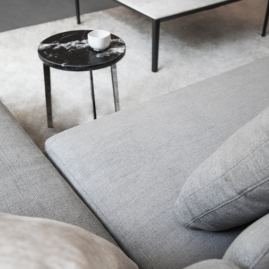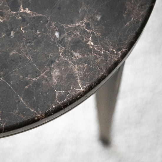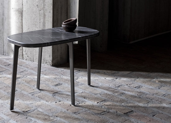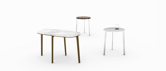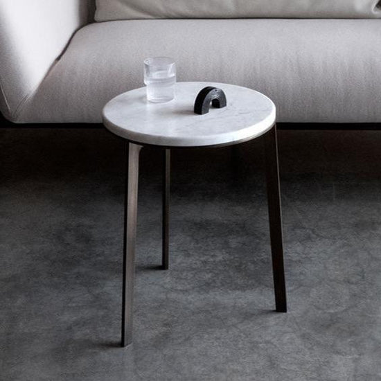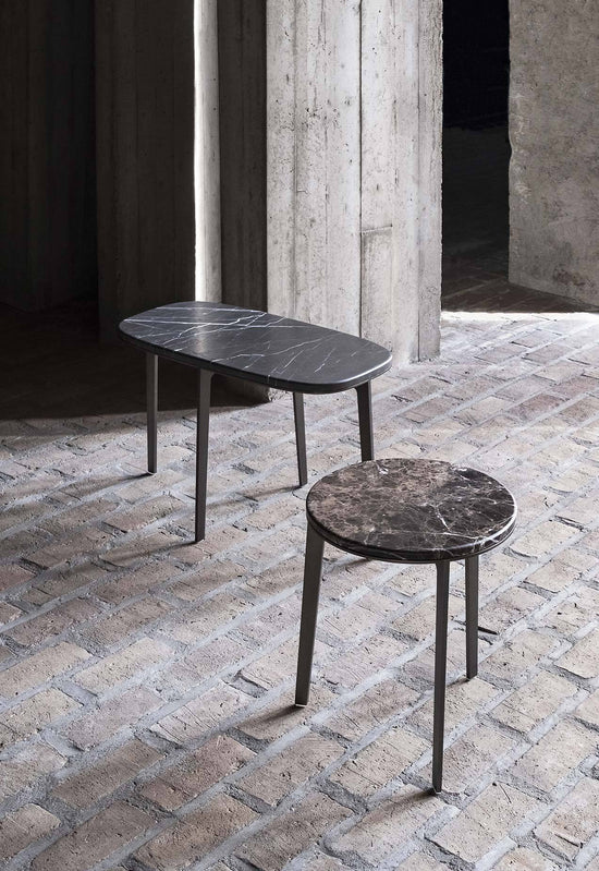 The Side are available in the four Bensen marbles—Carrara, Emperador, Graphite, and Nero Marquina. The frame is either chromed or finished with a bronzato metal finish.