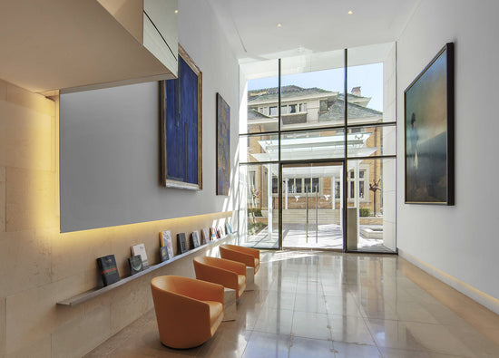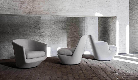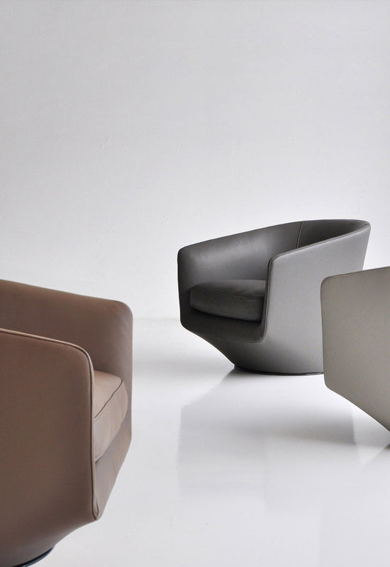 Its sophisticated form allows it to be used in a wide variety of aesthetic environments from traditional to the most modern and is suitable for contract use. Its most distinctive visual element is the seat under-cut which provides foot space for greater ease when getting out of the chair. The generously scaled seat, back support, and luxurious seat cushion achieve superb comfort while occupying a surprisingly small footprint.
