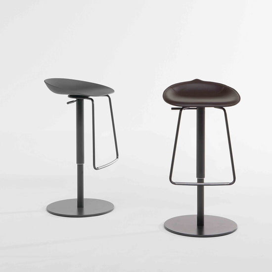 The rounded and soft lines of Tab bring to mind the world of nature: the seat is in fact smoothed as if it were a pebble, so as to make the stool, together with the footrest, even more welcoming for a well-deserved moment of relaxation. Tab is available in polypropylene or in emery leather upholstery for a touch of elegance and warmth.