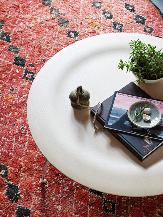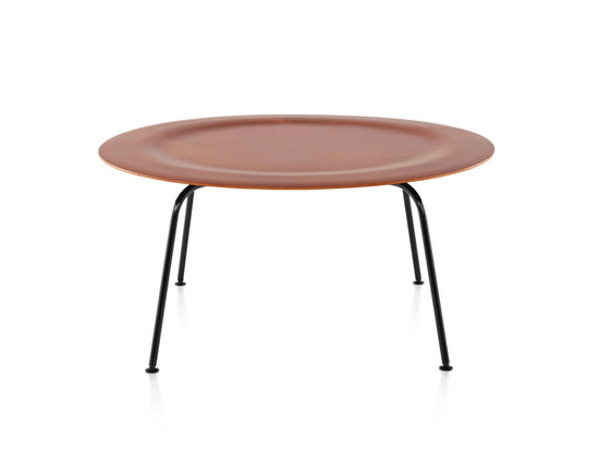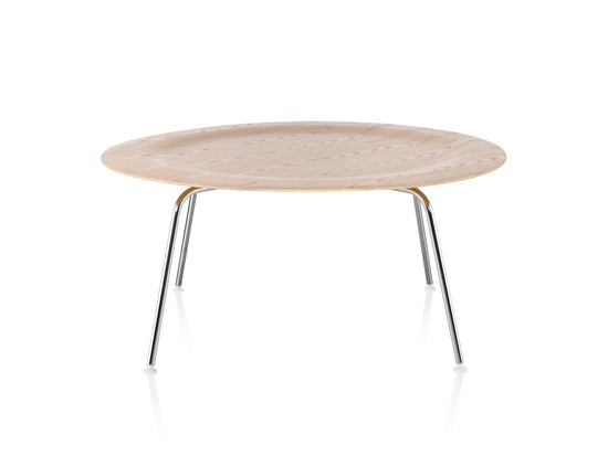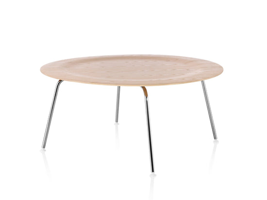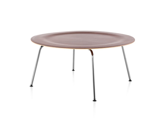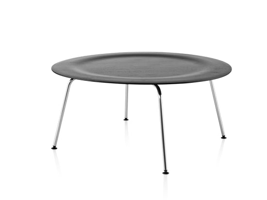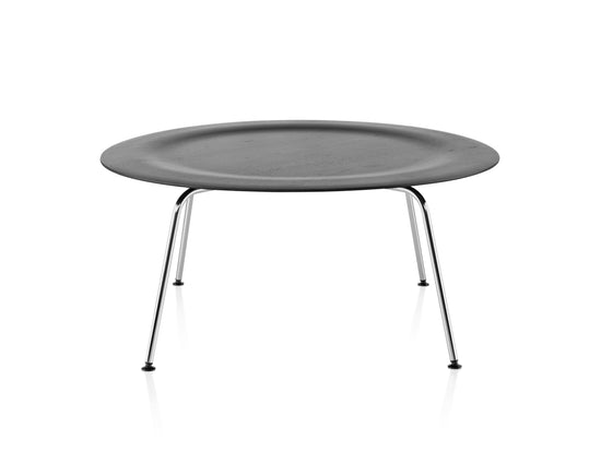 Lightweight and compact, this table is an eloquent example of early Eames design. Formed by breakthrough technology that molds plywood veneer into curved shapes, its round top is slightly indented and comes in a range of finishes. Supporting it are slim metal legs in black or trivalent chrome. Complemented by lounge chairs or sofa seating, it creates a striking centerpiece in any space.