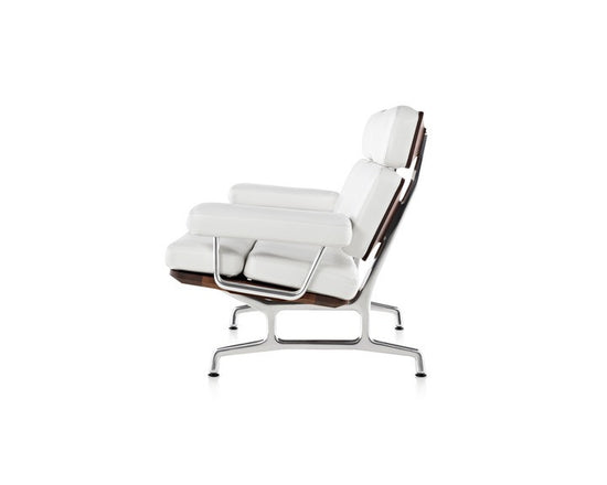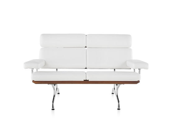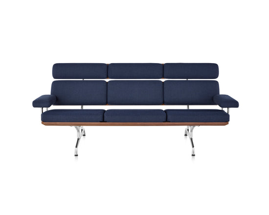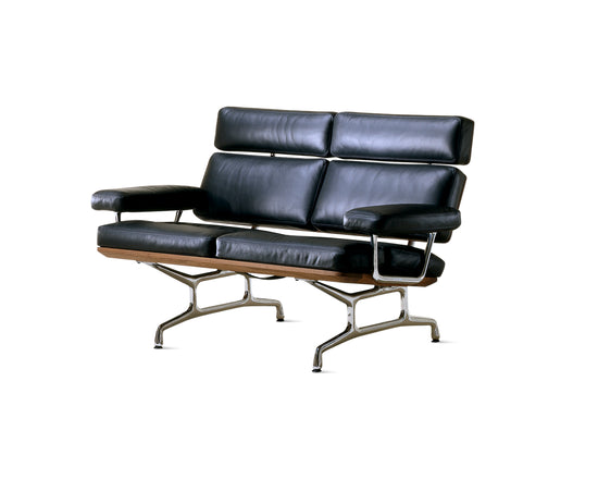 One of the last pieces of furniture from the Eames office, the Eames Sofa (1967) was designed to be a low-profile piece of furniture that would fit in the tightest of living spaces. This modern three-seat leather sofa features a solid wood back and frame panels finished with gunstock oil. Polished aluminum legs and arm supports complement cushions expertly upholstered in luxurious black leather. A rarity among sofas, this authentic Eames couch by Herman Miller has been in production since 1984.