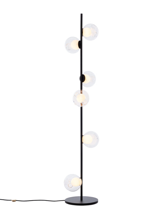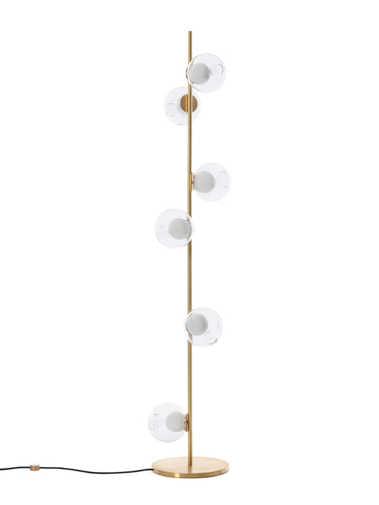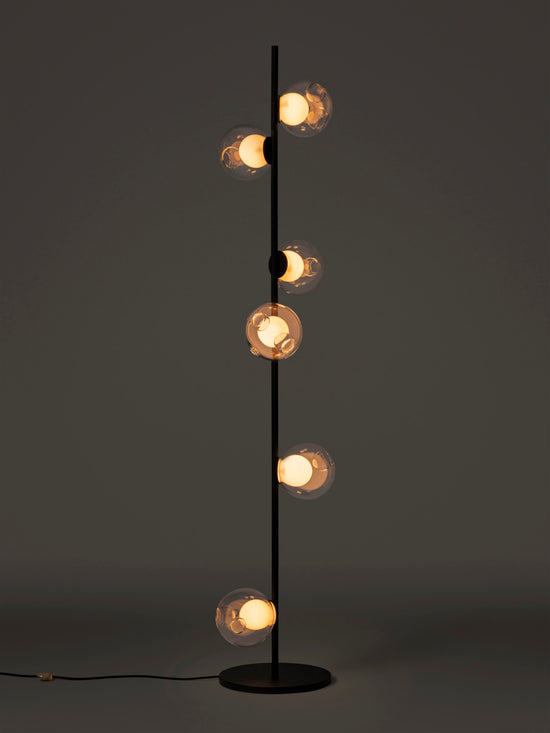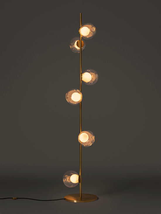 28.6 is comprised of 6 hand blown glass pendants mounted on a long stem (1.8m) available in black powder coated or brass finish with a 350mm diameter base.