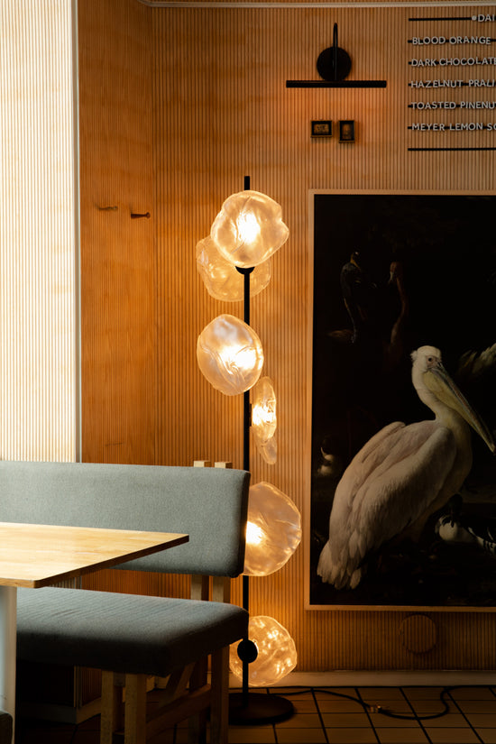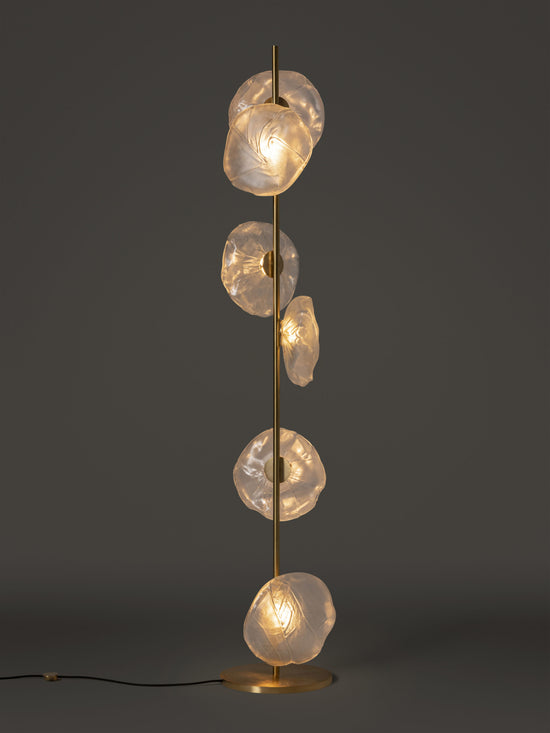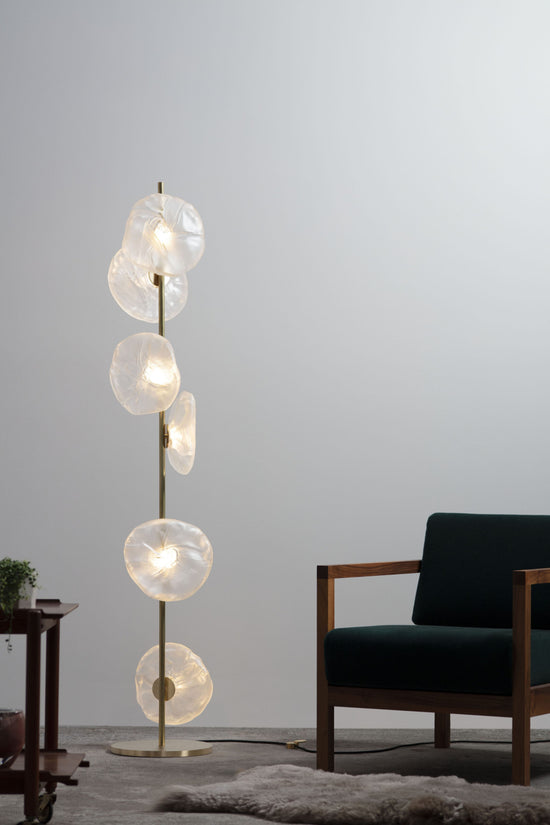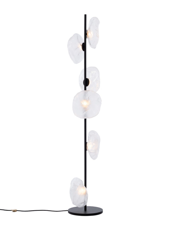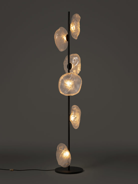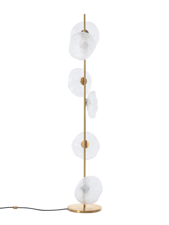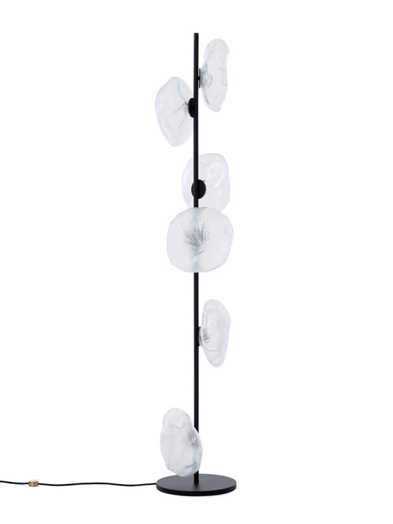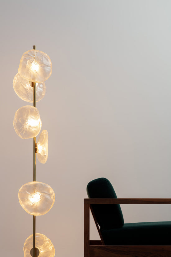 73.6 is composed of six hand-blown glass pendants mounted on a long stem (1.8m) available in black powder-coated or brass finish with a 350mm diameter base.