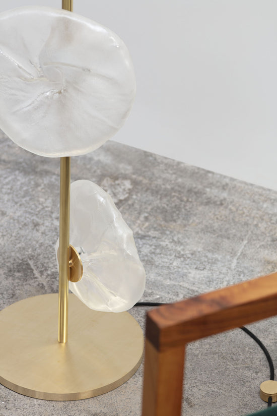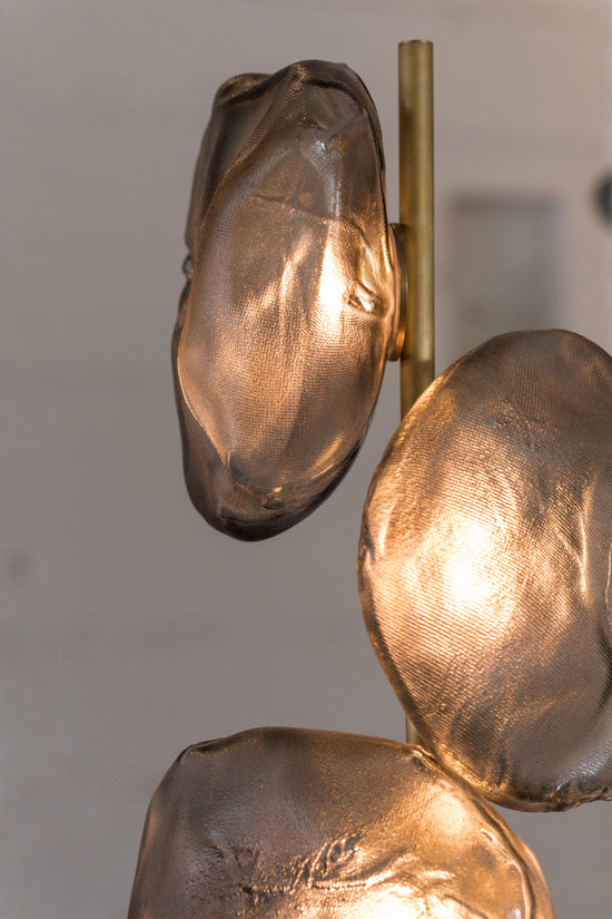 The 73 is formed by blowing liquid glass into a folded and highly heat-resistant ceramic fabric vessel. The resulting shape has a formal and textural expression intuitively associated with fabric, which becomes permanent and rigid as it cools. Each 73 is completely unique in proportion, size and shape.