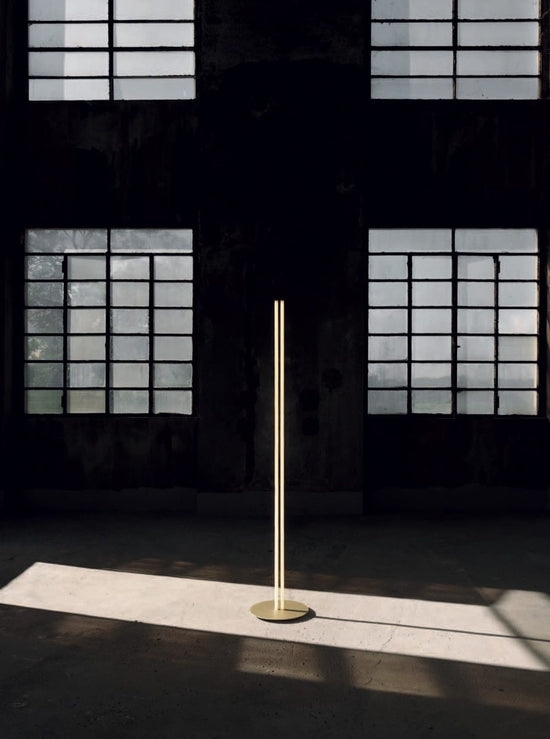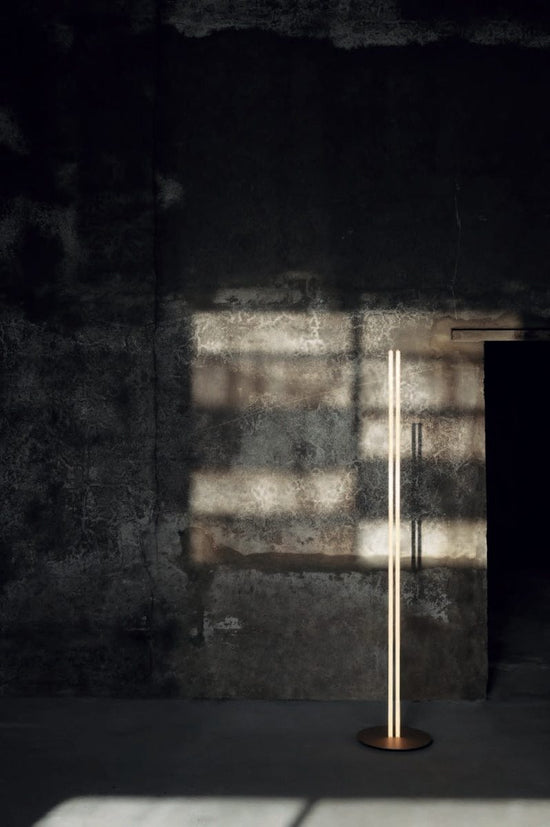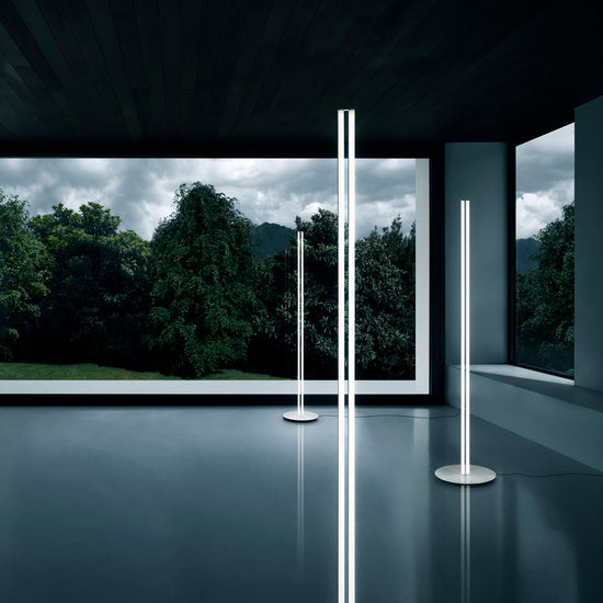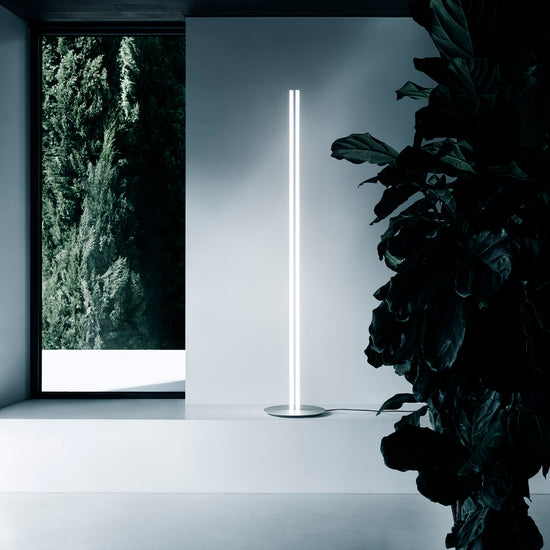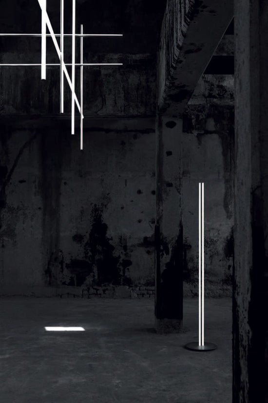 Coordinates’ collection consist of horizontal and vertical LED strip lights that form illuminated grid-like structures of various complexities. A vertical floor lamp model featuring a simple round base and two lighting bars, which can be set at the preferred beam angle during assembly.