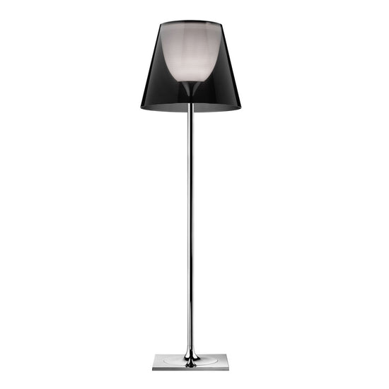 Subtle yet striking, the KTribe floor lamp by Philippe Starck provides diffused light through a transparent diffuser that gracefully moves the eye upward. The base, rod support, and diffuser support are die-cast, polished, and chrome-plated Zamak alloy. The rod is polished aluminum. The opal inner diffuser and support for the lamp holder are injection-molded PC (polycarbonate). Outer diffusers are transparent PMMA (Polymethyl methacrylate), available in silver or bronze. The upper ring is injection-molded PC, and is completely transparent (or transparent brown for the outer bronze diffuser).