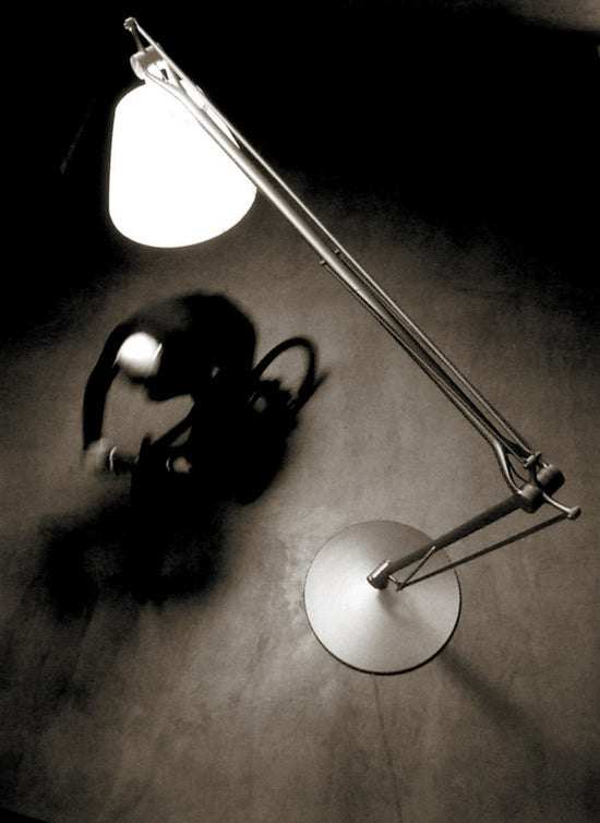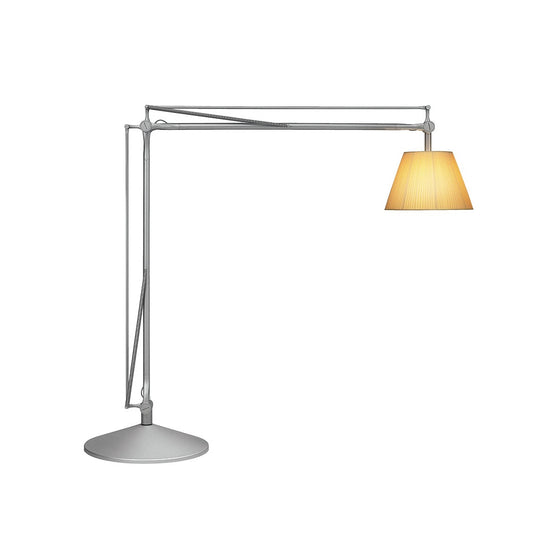 A brilliant play on perspective, Superarchimoon feels oversized and magnificent, providing direct and diffused light via a pleated cloth external diffuser and acid-etched, hand-blown glass internal diffuser. The diffuser support is sandcast aluminum, and the gray-painted assembly is composed of tubular aluminum arms and tie rods, a stainless steel spring, and die-cast aluminum joints. The sand-cast aluminum base features six lead counterweights and a painted gray spun-aluminum base cover.