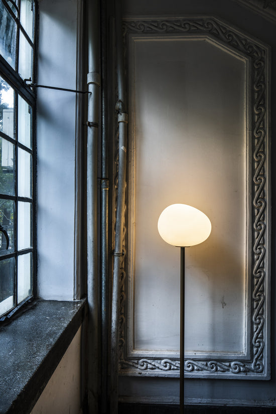 Gregg’s shape is reminiscent of a large pebble, its surface polished by the water. Made of hand-blown glass, this floor version is part of the Mix&Match System and is available in 2 sizes and 3 colours that can be combined in a flexible way, to define and coordinate the lighting of diverse environments.