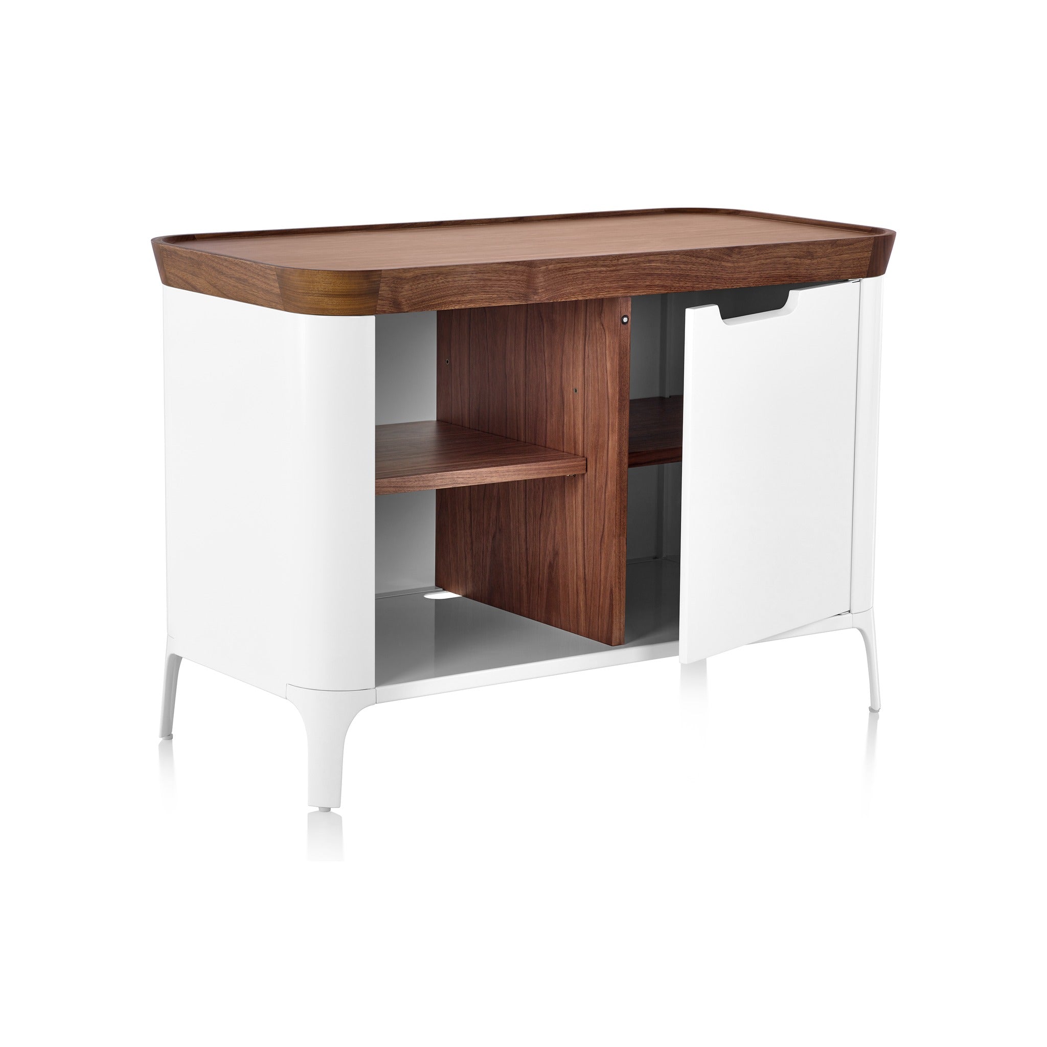 - Materials: A sculpted walnut wood top provides a surface for display and contrasts against a sleek aluminum body that contains a combination of open and closed shelving.