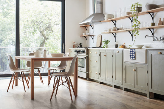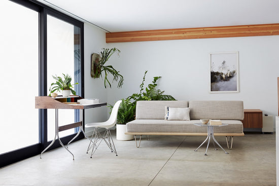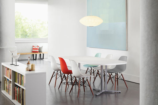 Charles and Ray Eames realized their first successful, single-shell form in 1950 with the Molded Fiberglass Chairs. However, when the environmental risks associated with fiberglass production became more widely understood, the decision was made to discontinue fiberglass shell production until a more suitable material could be found. In 2001, Herman Miller reintroduced the Molded Plastic Chair in polypropylene. In addition to being 100 percent recyclable, the polypropylene shell chair's subtle matte texture offers a soft tactility as well as notable durability.