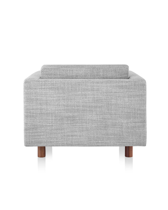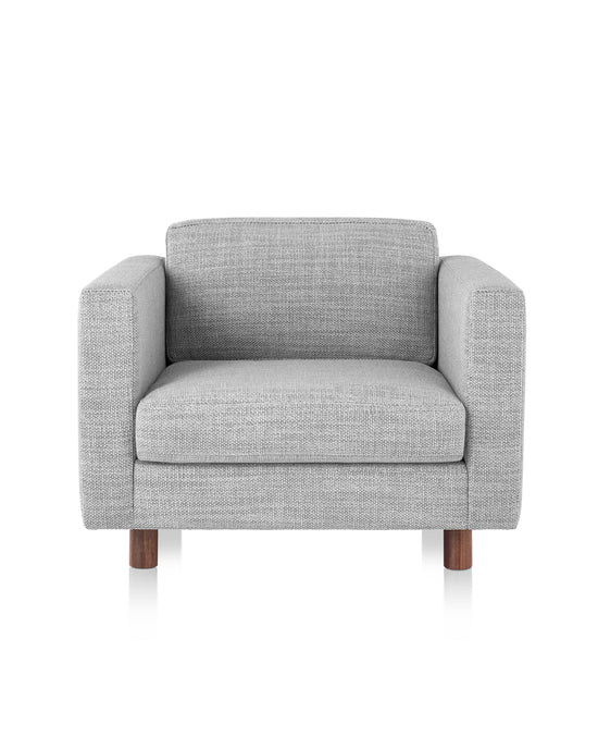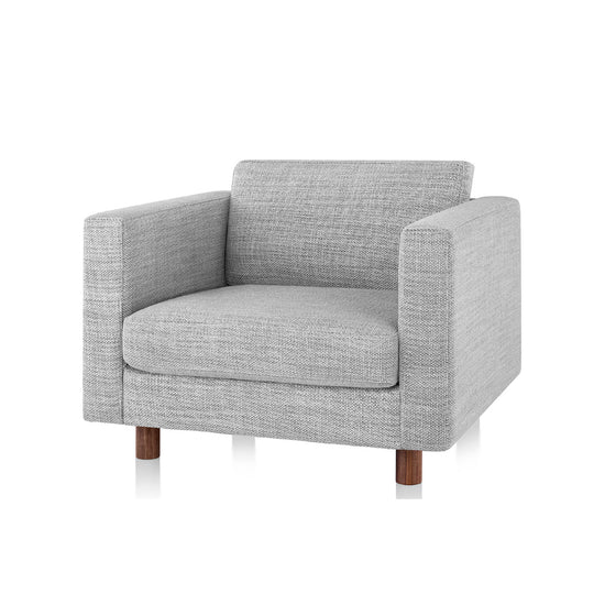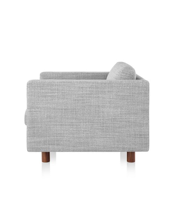 The sofa group offers a beautiful proportion with a sit height of 15" and a depth of 23.5". The pieces also feature a depth pitch of 1.25", contributing to the overall feel of lounging and relaxation. The rounded wooden legs offer a quiet, yet contrasting element at 4" in height, and are available in walnut and white oak finishes.