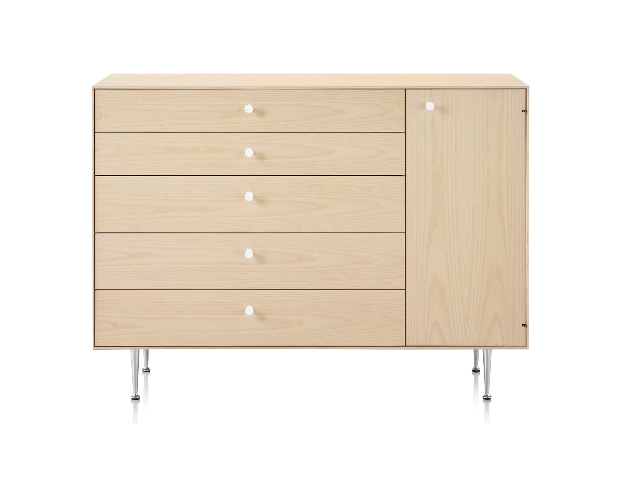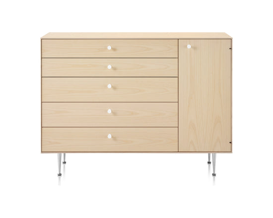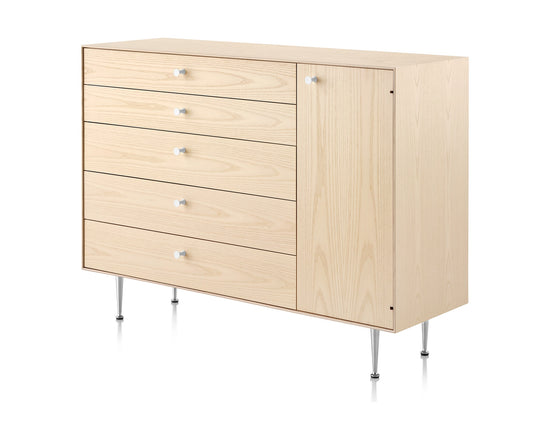 A combination of drawers and shelves, the Nelson Thin Edge Chest Cabinet offers flexibility in storage options. Five wide drawers in solid wood construction with soft-closing slides are paired with a one-door cabinet on the side. Adjustable shelves allow for articles of different sizes to be organized easily and creatively.