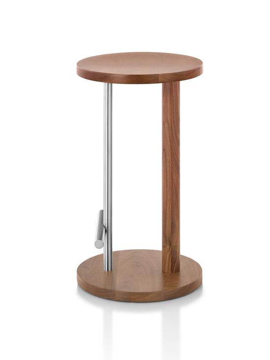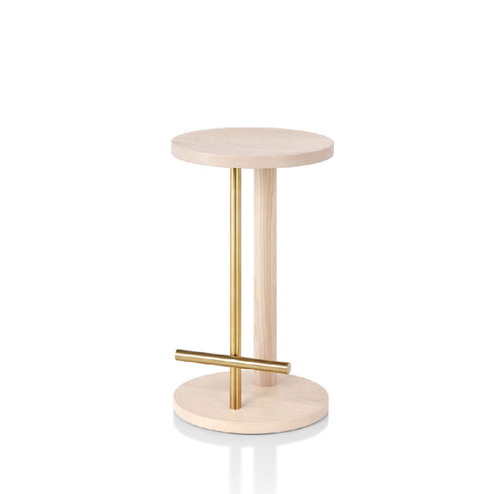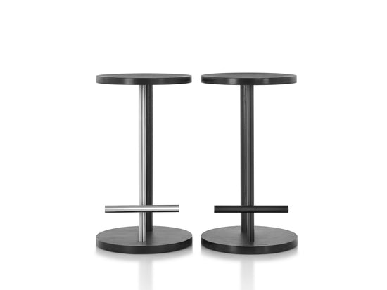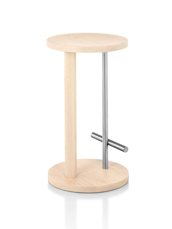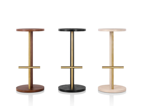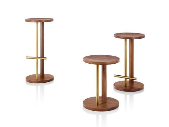Two parallel legs join the circular seat and base together in the kindred pairing of metal and wood. Offered in three heights, with the two tallest outfitted with a crossbar footrest, Spot Stools bring an austere sense of elegance to any interior.