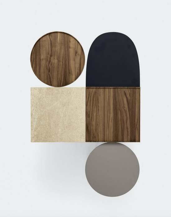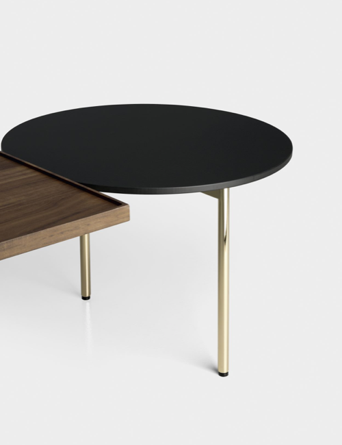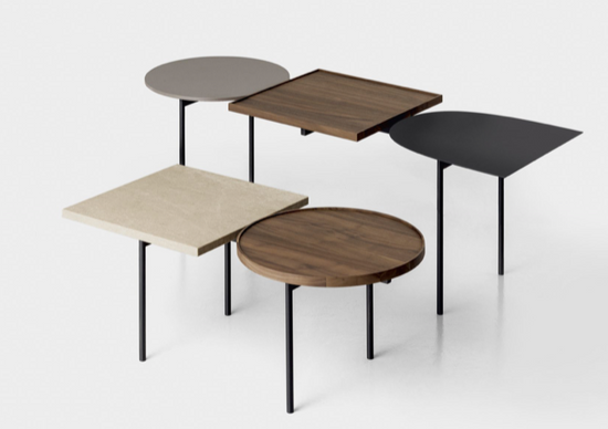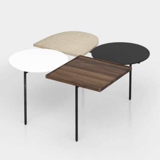 The effect is an abstraction of suspended objects: a constellation. The coffee tables are available in two heights and can combine two, three or four elements, choosing from lacquered tops in five colours or in wood, Fenix-NTM® or stone.