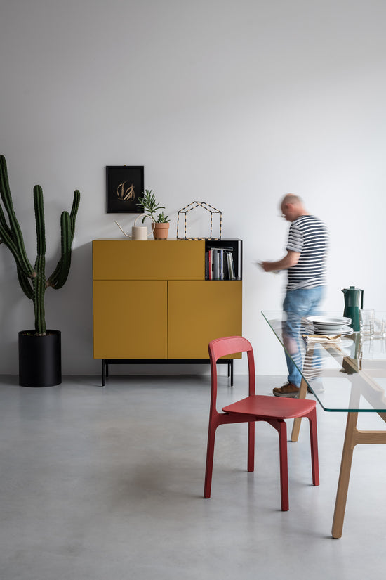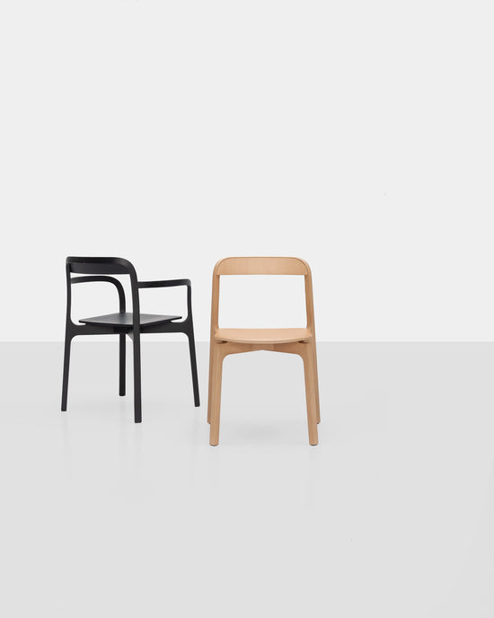 For the Contorna collection, the designers Ramos and Bassols focus on the idea of the chair as a micro architecture in wood, lightweight and harmonious. Sinuous lines and fine surfaces delineate its contours, whereas the minimalist design is given warm appeal by the solidity of natural or stained ash wood. Elegant and contemporary, Contorna reinterprets the art of cabinet-making from an industrial perspective, since the individual pieces of solid wood are machined by a robot and finished by hand. Contorna is available in a chair and armchair version, with a wood seat.
