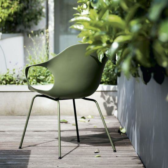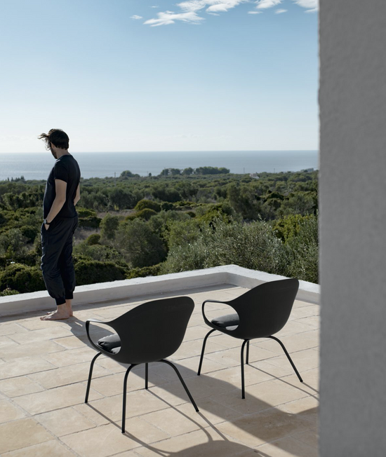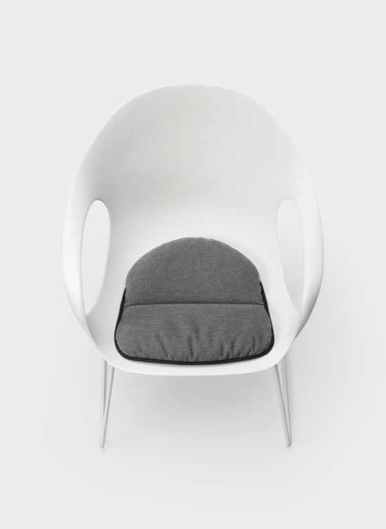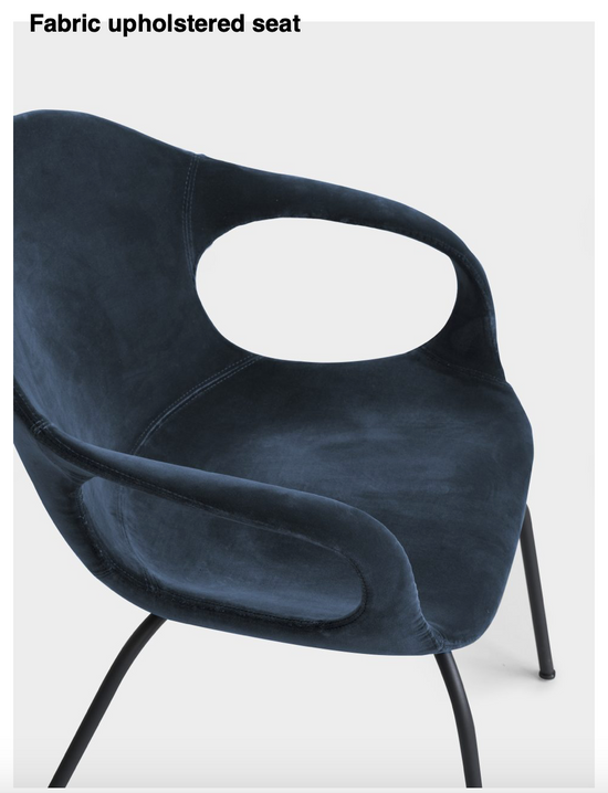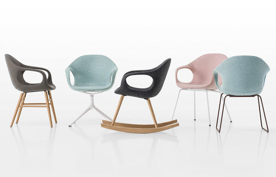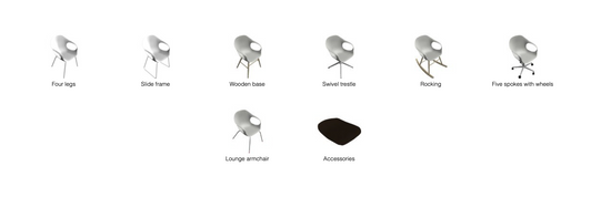 The structure is available in polyurethane, with cushions; padded and covered in hide, with the characteristic reinforced ribbing reminiscent of the backbone of an elephant; padded and upholstered in fabric, with hand-stitched seams. In addition to wood or metal legs, the chair is available with a slide-frame base, rocking base, swivel base or castors. The chair can be complemented with a removable Lips cushion, in a round or shaped version, to create the most varied colour combinations.