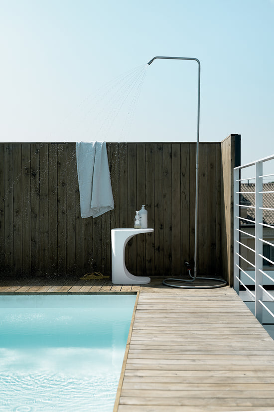 Font is available in two finishes that define its style: textured and sculptural in a light or dark cement version or pure and minimalist in white Cristalplant®, a resistant, eco-sustainable and recyclable solid surface, to which a device with a USB output can be applied that is handy for charging electronic devices.