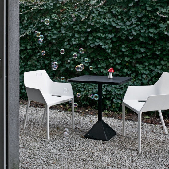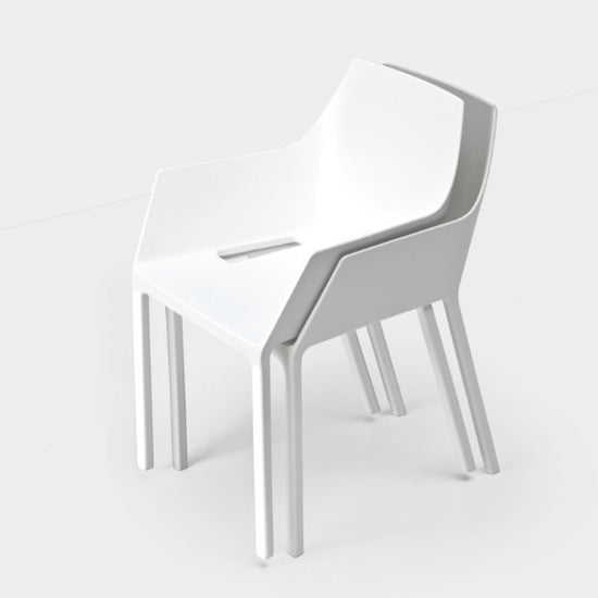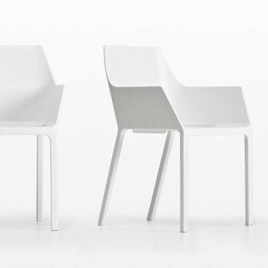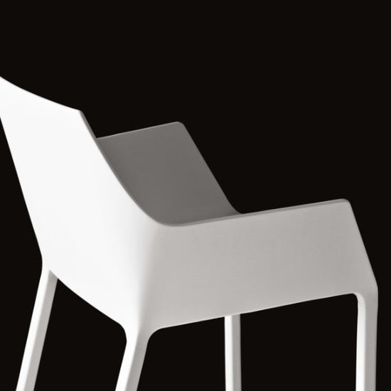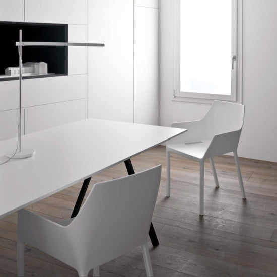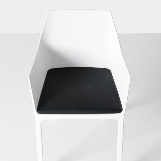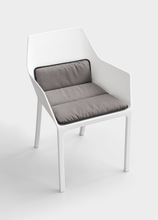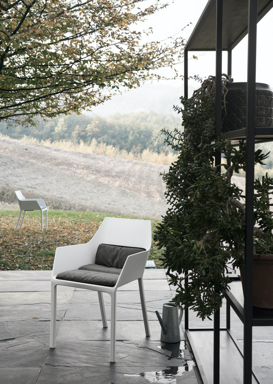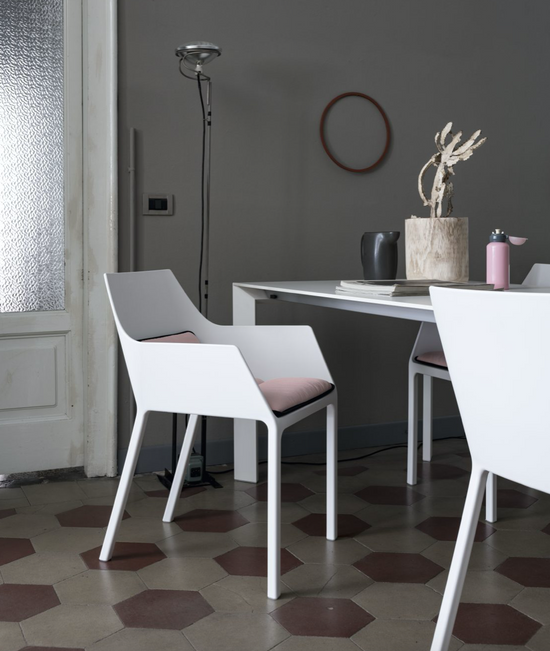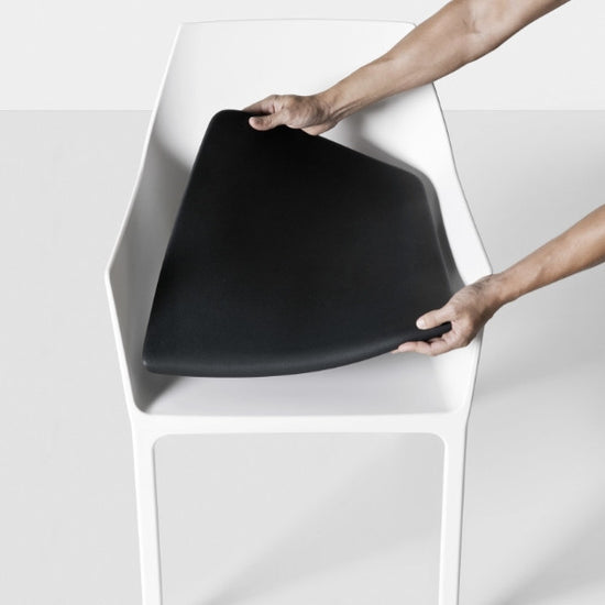 Made of injection-moulded polypropylene reinforced with glass, the Mem chair by Christophe Pillet, with its barely highlighted angles and curves, combines strength with elegance. The two holes in the seat are aesthetic yet also functional details, since they make the chair stackable despite its embracing shape. Mem is also available with a removable soft polyurethane cushion that matches or contrasts with the seat, or with a lumbar cushion upholstered in a choice of fabrics, making the seat even more comfortable.