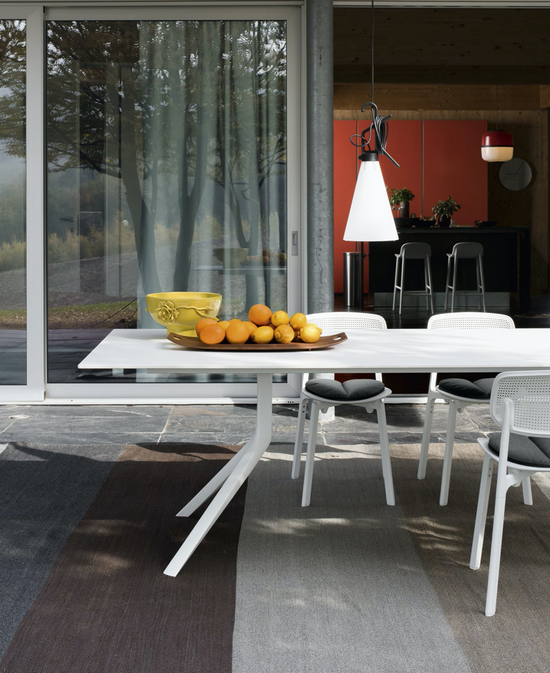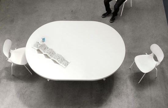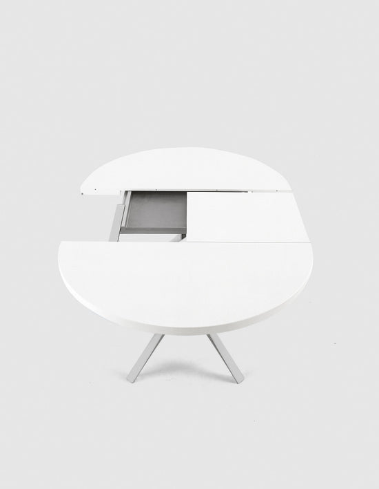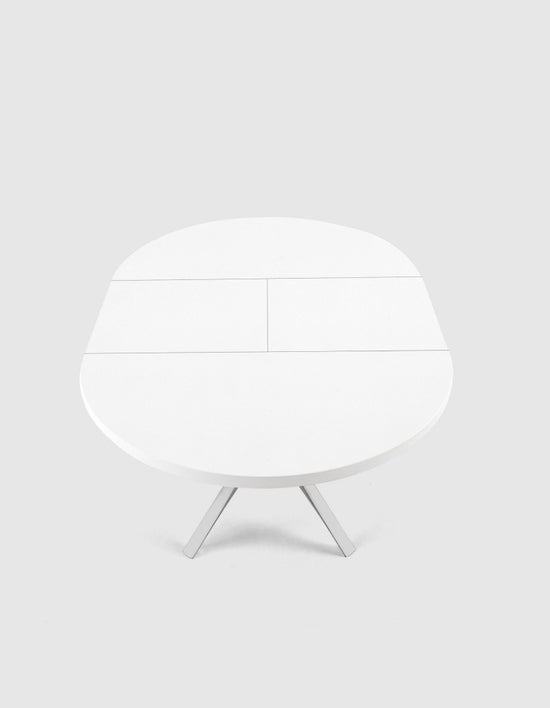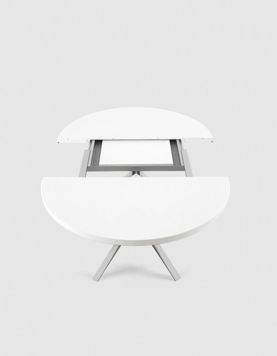 Designed by Monica Graffeo in 2006, Oops is an extendable table with an aluminium base and a 50mm thick lacquered top that extends from a round to an ellipsoidal shape. In technical terms, this table is impeccable when closed or open due to its aesthetic appeal and sturdiness.