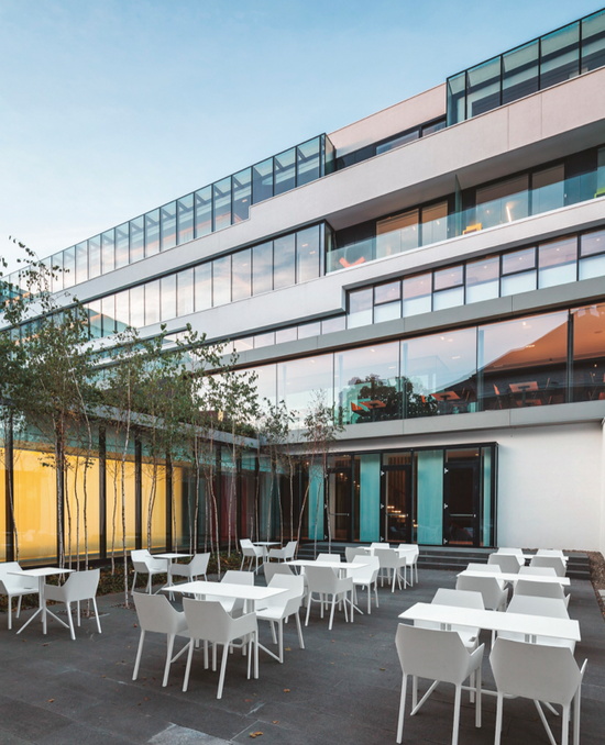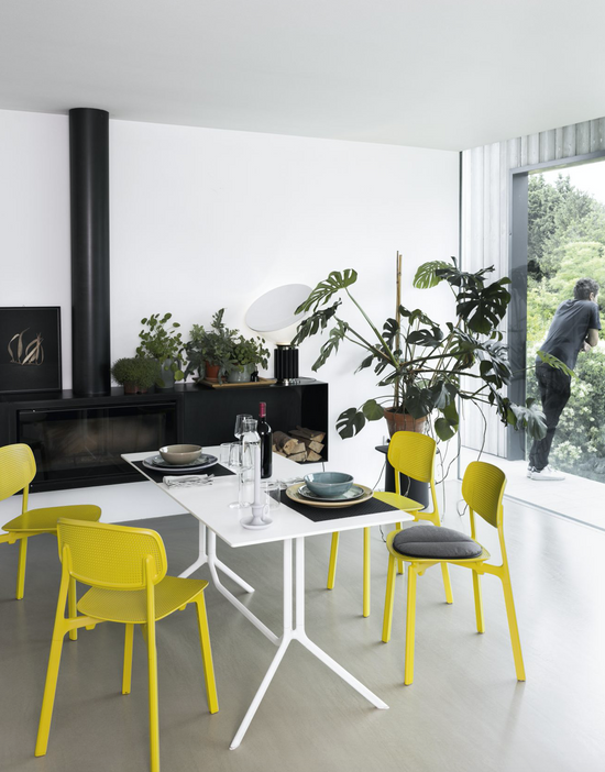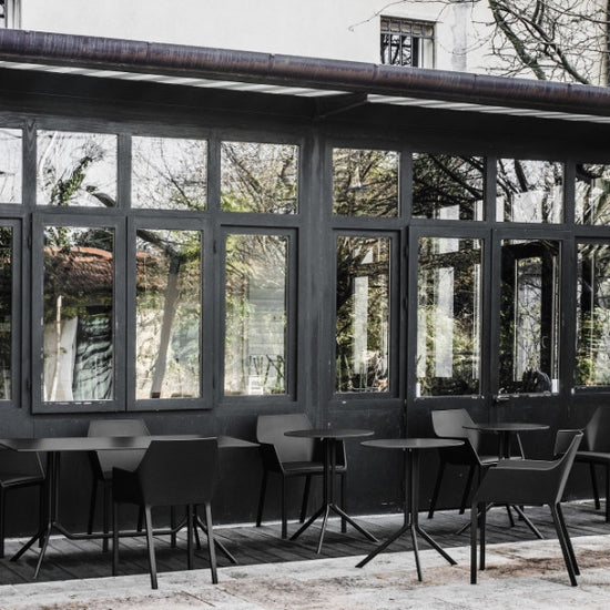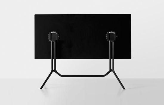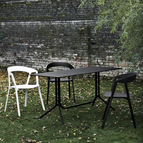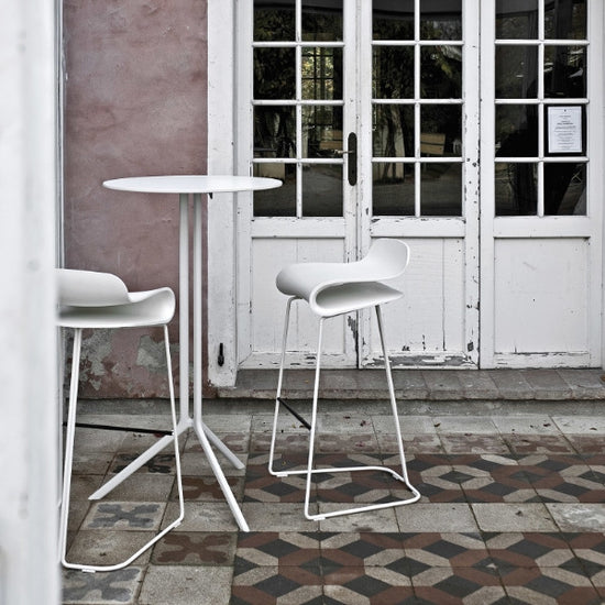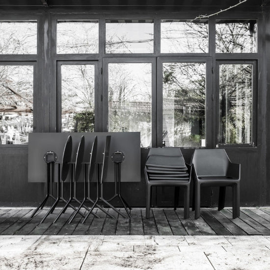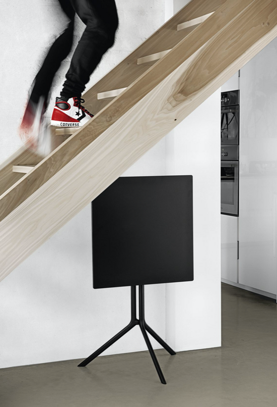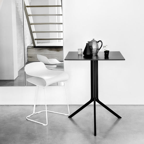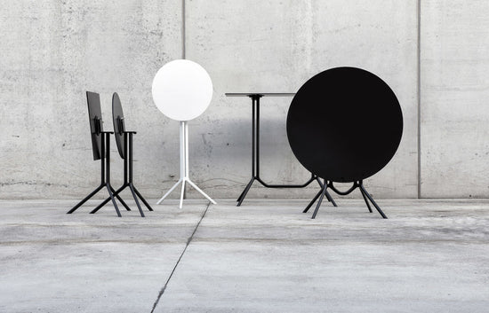 Lightweight and durable, they are ideal for use in a variety of contexts. Poule is made of black or white painted aluminium. It has a round, square or rectangular top in laminate or Fenix-NTM®. Poule is also available in a folding version so that it can be stored when not required and where space is limited.