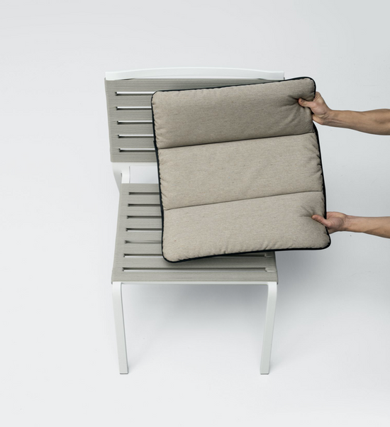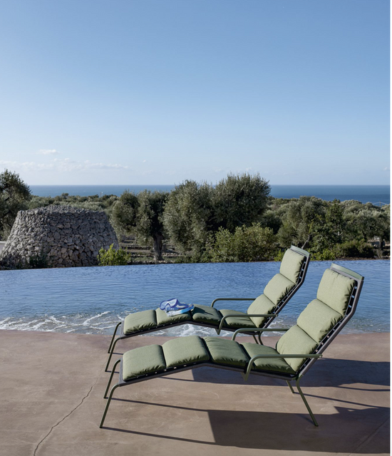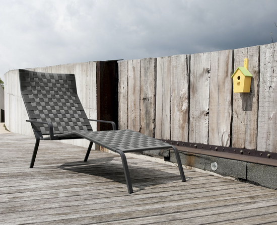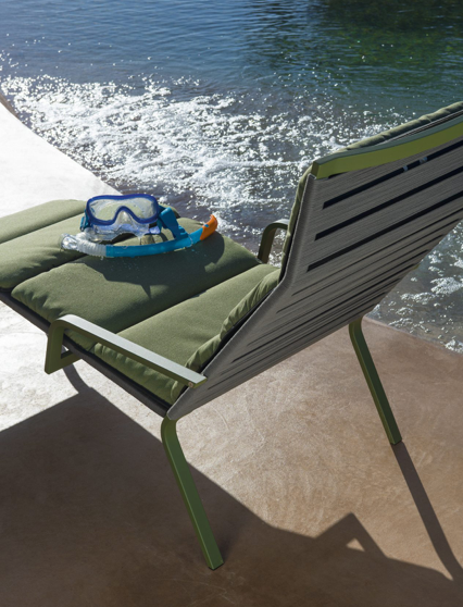 An entire collection developed together with two outdoor design specialists: Harry&Camila. It includes a stackable chair and lounge chair with or without armrests, a stackable chaise lounge and a lounger on wheels. They have powder-coated aluminium frames suitable for outdoor use, whereas upholstery is made of polyester rope or interlaced straps. The items in the Rest collection can be made even more comfortable and attractive by adding Lips removable padding, available in a variety of colour combinations.