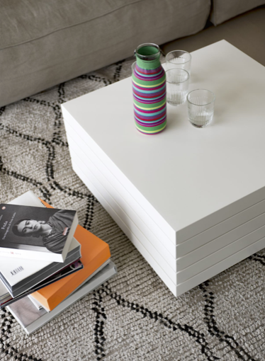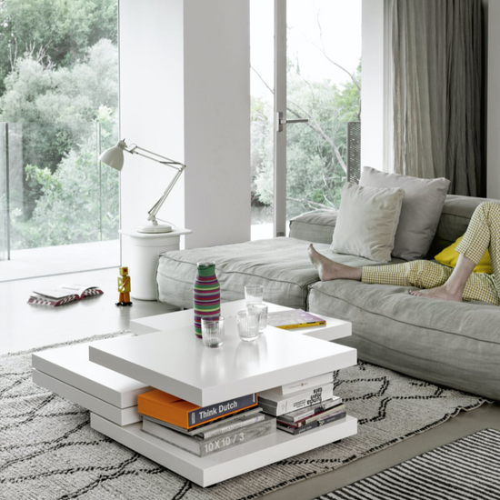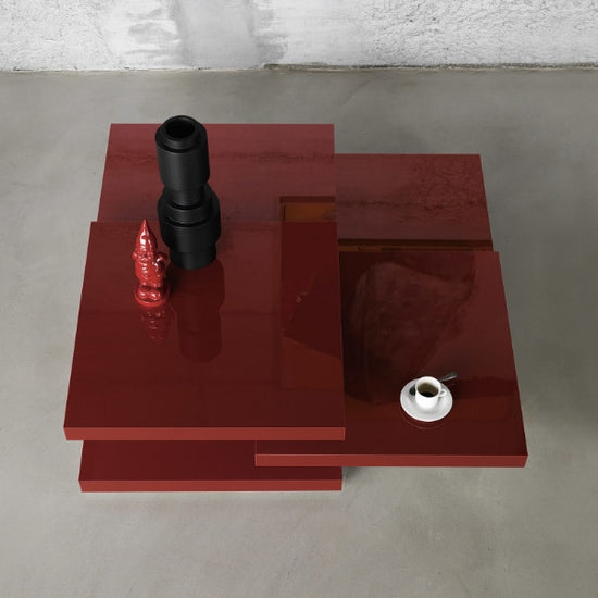 Rotor is a coffee table for the living room comprising five overlapping surfaces. The upper and lower tops are fixed, whereas the three middle tops can rotate 360°, providing various regular or irregular shapes that increase the surface area even four-fold. When completely closed, Rotor becomes a simple minimalist element, compact in size.