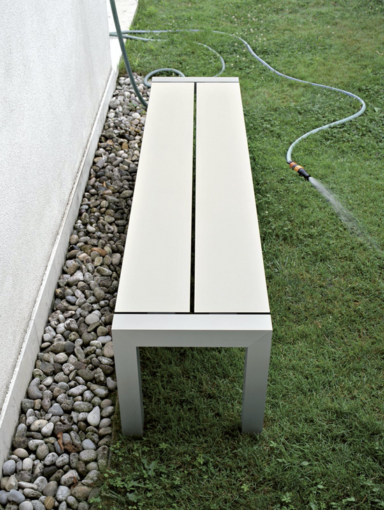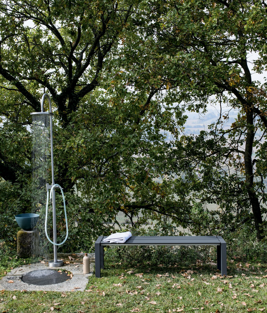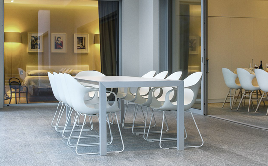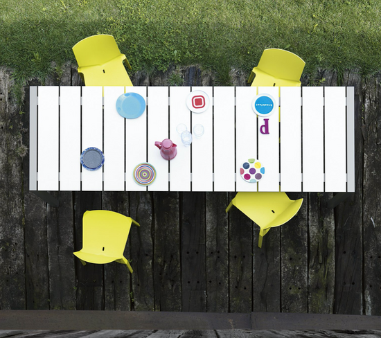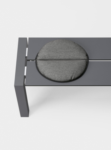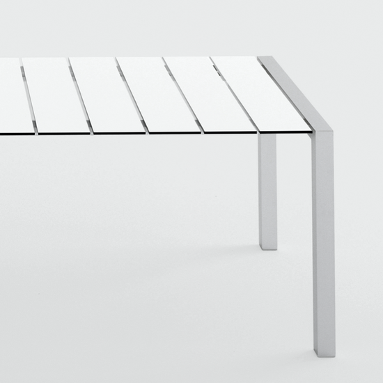 The top is made of thin Fenix-NTM® slats: a material with warm and soft aesthetic, which is light, sturdy and resistant to weathering. The frame is made of anodized aluminium, an eco-friendly material ideal for outdoor use. In addition to a wide range of tables in different sizes, the collection includes a matching bench for use as a chair or a versatile furnishing accessory, which can be complemented with a Lips removable cushion.