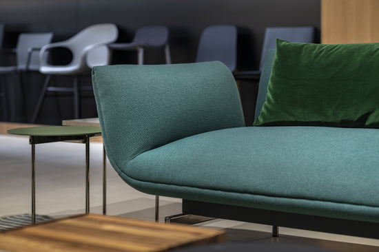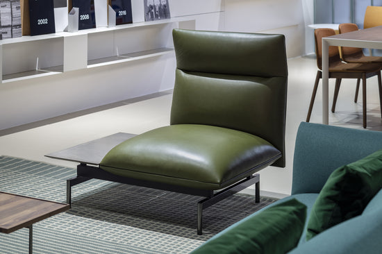 The padded items, which can be combined as required to create sofas, sofas with a peninsula element or a pouf, also with built-in tabletops, are soft and comfortable, whereas the upholstery in fabric or leather features tailored details. The element with a reclining headrest offers extra comfort to those who love reading or watching TV.
