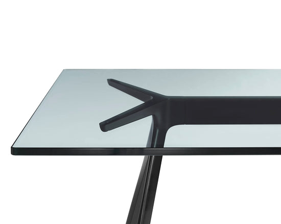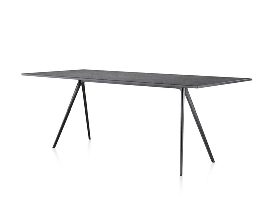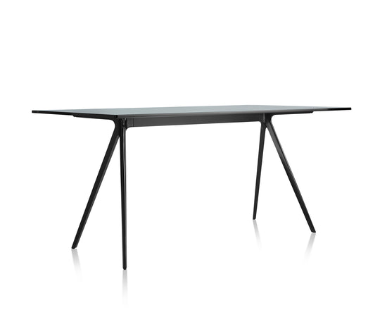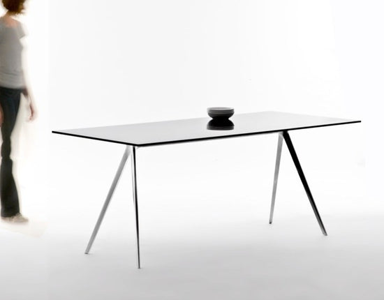 Material: legs in die-cast aluminium polished or painted in polyester powder. Crosspiece in aluminium polished or painted in polyester powder. Top in tempered glass or in Italian ardesia slate, painted MDF or American walnut. Versions for outdoor use available.