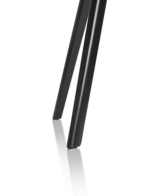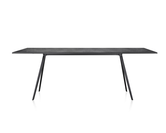 Baguette for most of us recalls a crusty French loaf, but it was the original definition of the word—“wand”—that inspired this table, which is available in two lengths: 62” and 80”. The long, thin top can be 1” MDF in white or black, clear or white glass, or slate or quartzite, and the cast aluminum legs and frame can be polished or painted white or black. All tops except MDF are suitable for outdoor use.