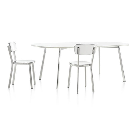 The outer back material of this chair is available in polished or painted aluminum. The seat and inner back material is die-cast aluminum, and the legs are extruded aluminum.
