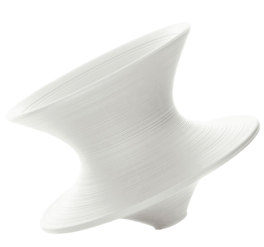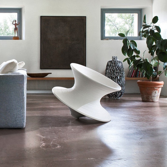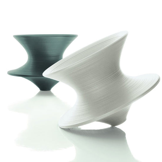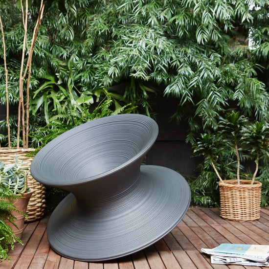 Upright, this fascinating piece looks like a sculptural vessel. But when leaned on its side, it forms a comfortable, functional chair that lets you rock side to side or spin around. Thomas Heatherwick worked with Magis to create Spun using a rotation molding method and materials that make it durable for outdoor use.
