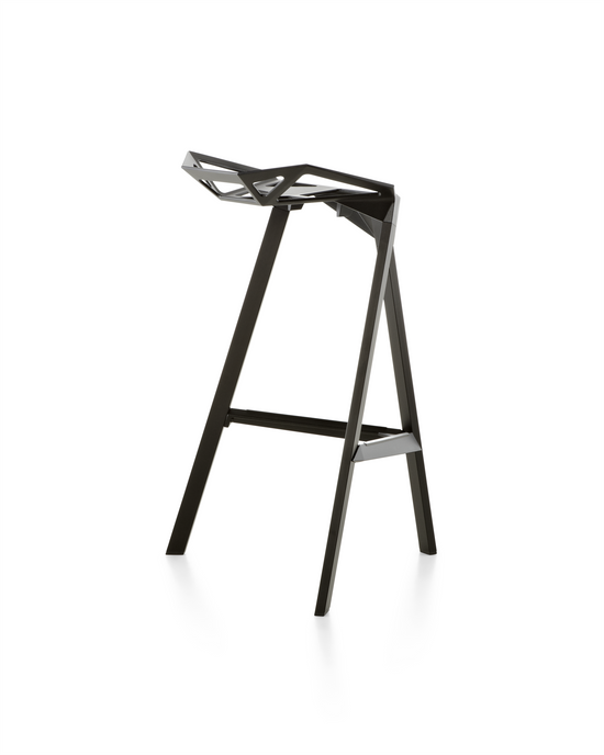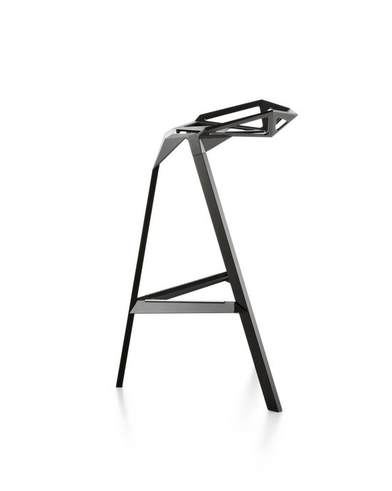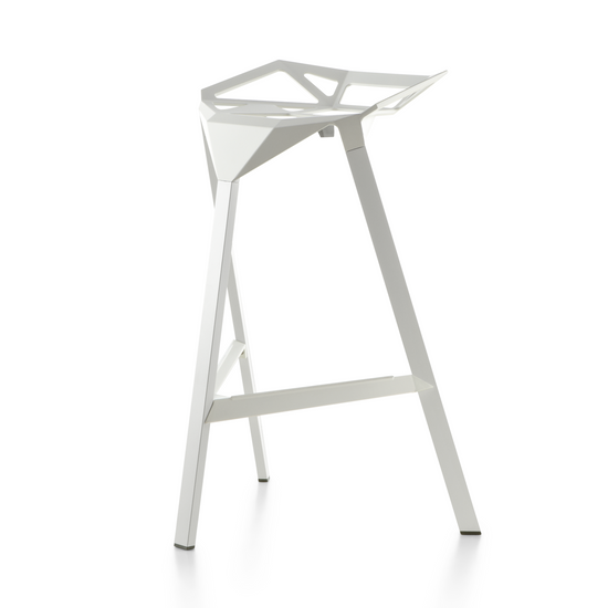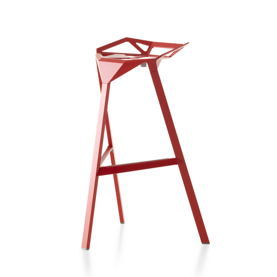 Material: legs in aluminium anodized or painted in polyester powder. Seat in die-cast aluminium treated with sputtered fluorinated titanium and painted in polyester powder. Available in red or white aluminum, black anodized aluminum, or polished aluminum. Stacks up to 6 stools high.