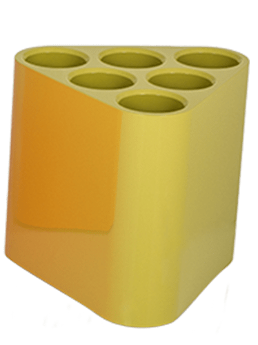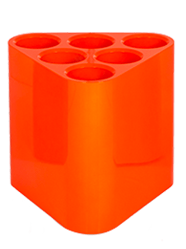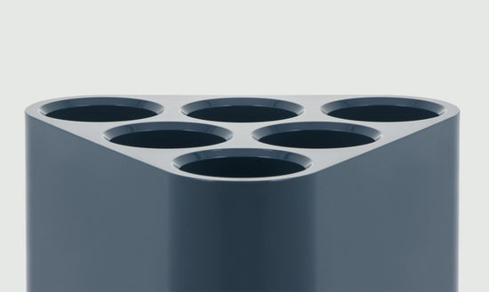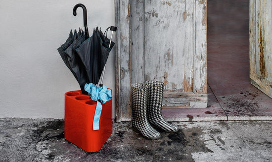 The Poppins umbrella stand for Magis allows long and short umbrellas to be easily popped in and stowed when dashing in from the rain. Its compact size and triangular shape make for easy placement in an entryway or hallway.