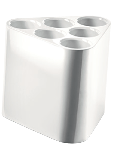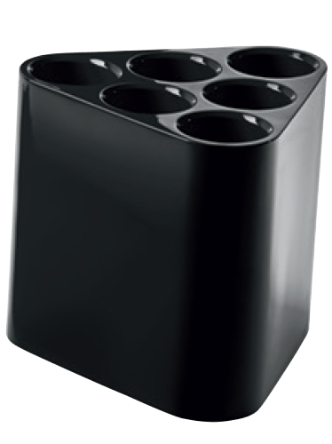 A simple series of holes enables furled or unfurled umbrellas of any size to be popped easily. Poppins feels both serious and playful; the glossy plastic emphasizes its waterproof qualities, while the form reminds us of a game – like the triangle used in billiards or snooker.