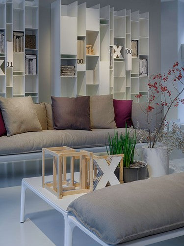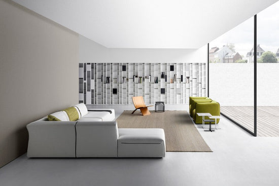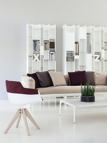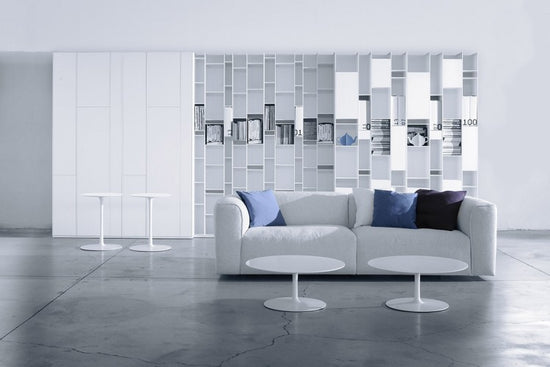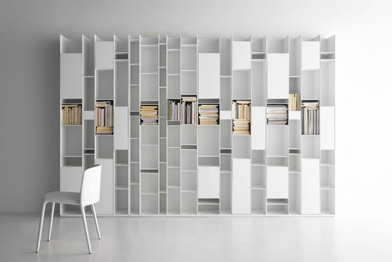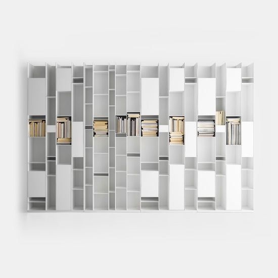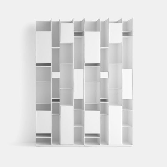 A bookcase with compartments in standard size, open or closed by doors, and with one drawer compartment. By flanking more units, also with Random Cabinet or Random, large-sized configurations of strong impact can be created.