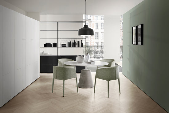 Made of medium-density wood fibreboards, in micro goffered white lacquer. Uprights and shelves in thickness 6mm; doors in thickness 12mm. The back is made from white melamine coated board (thickness 10 mm).