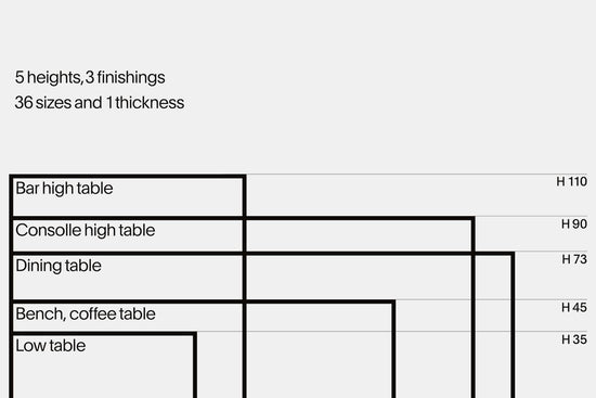 In 2019, to celebrate the 10th anniversary of the Tense table, MDF Italia introduces NEW SIZES AND FOUR NEW HEIGHTS (H35, H45, H90, H110 cm). So, a real table system was created, divided into 5 categories according to five heights, in order to meet different market needs: low table, coffee table/bench, dining table/working table, console/high table/high working table, high table bar/office.