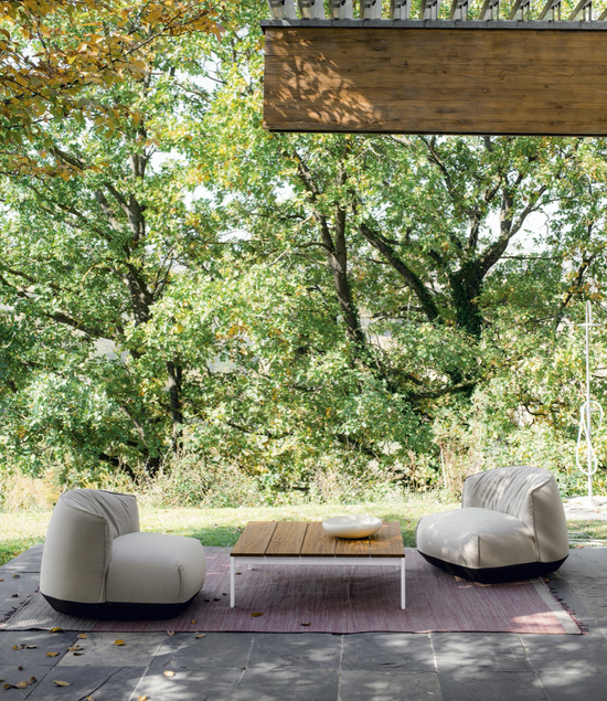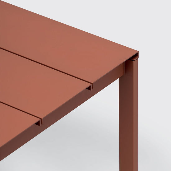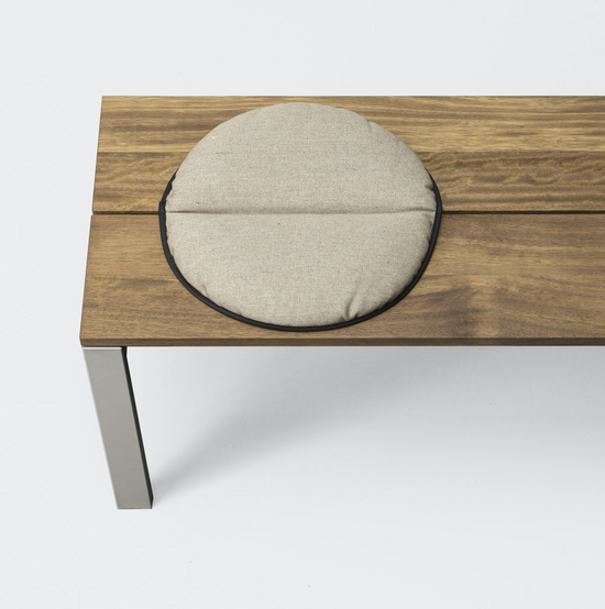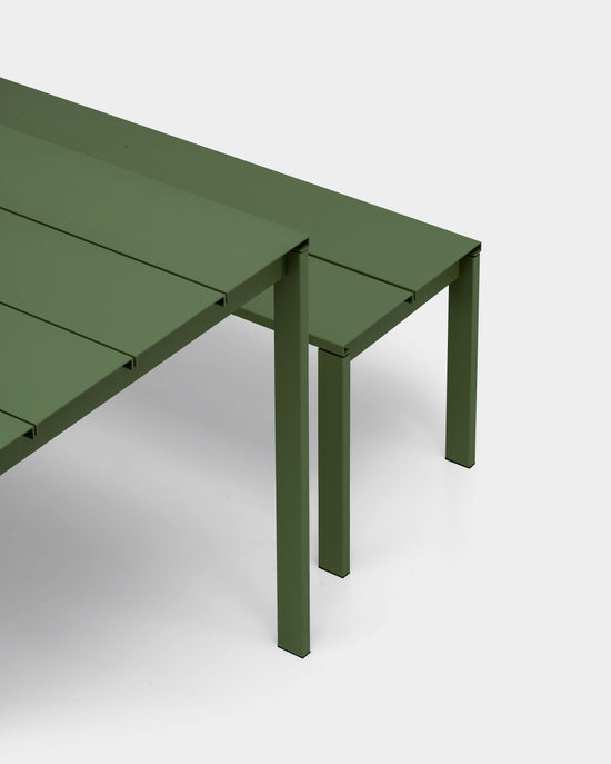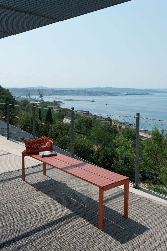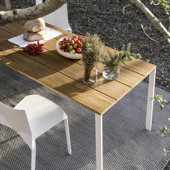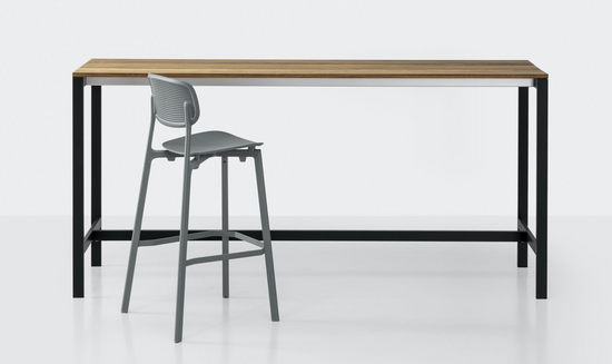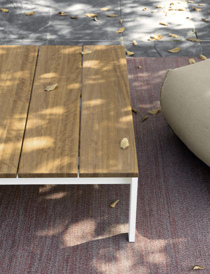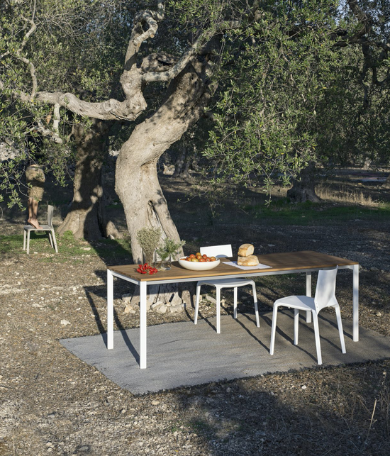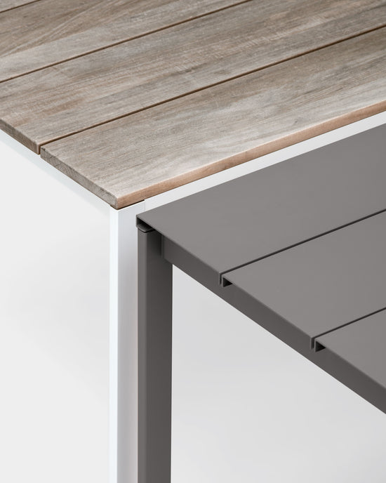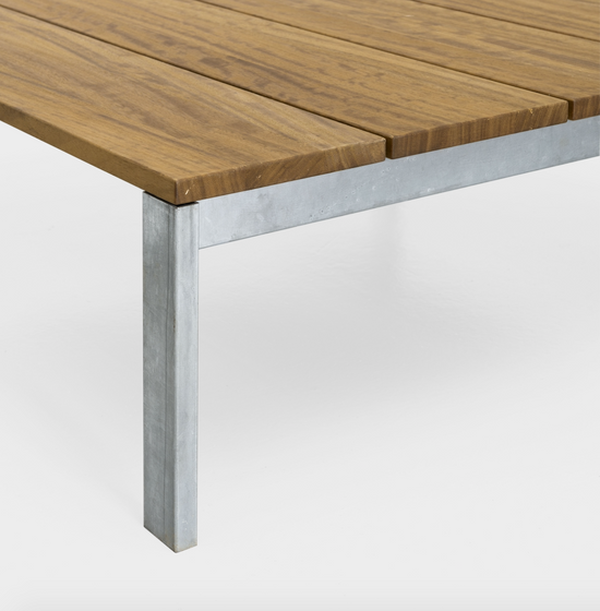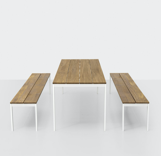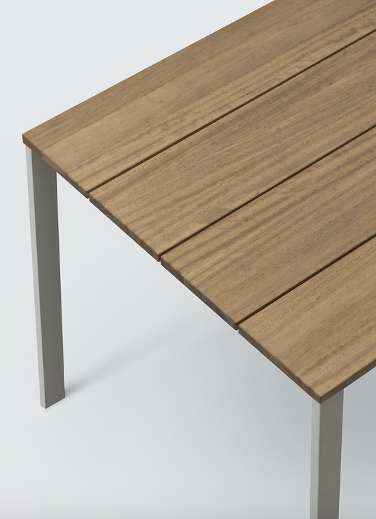 A complete collection of tables, benches and small tables for outdoor use, including a bar table or bar counter, in a simple versatile design, with crosspieces made of anodised aluminium. It has zinc-coated steel or powder-coated steel legs, also available in customised heights. The top, with 20 cm wide and 2 cm thick slats, is made of Teak wood from FSC certified plantations that respect the environment. It can be left to acquire a silvery colour over time, or treated with oil to maintain its natural shade.