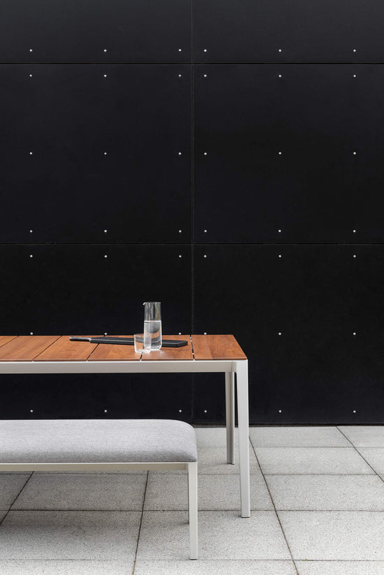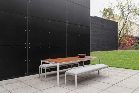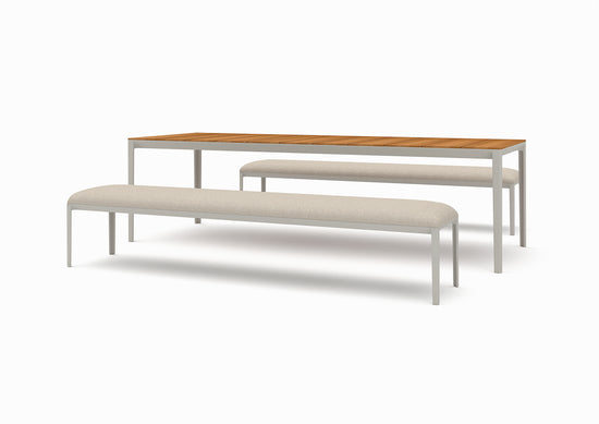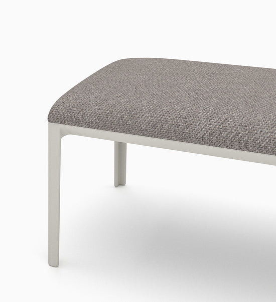 The immense strength of the cast aluminum legs produces lengthy bench proportions, that augment the airy effect of the chamfered border edges. Available in a curated selected of exterior rated fabrics to complement or contrast the sand gray finish of the bench legs.