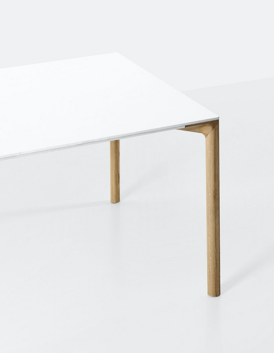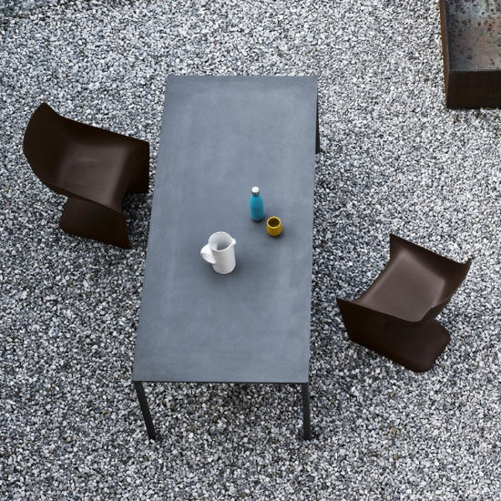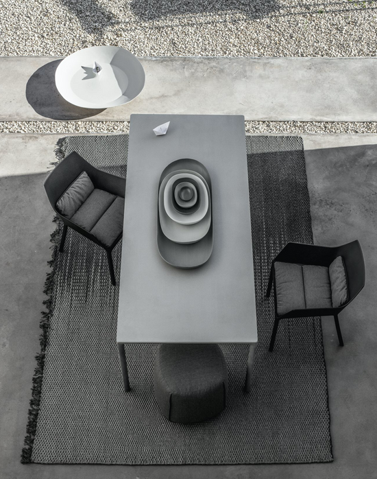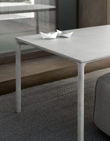 Subsequently, the Boiacca table was given a more traditional shape, with a Pure-white laminate or Fenix-NTM top® and wood legs with a metal core – a highly technological and finely crafted product. Still very up-to-date, the cement version is available in two colours, one light and one dark.